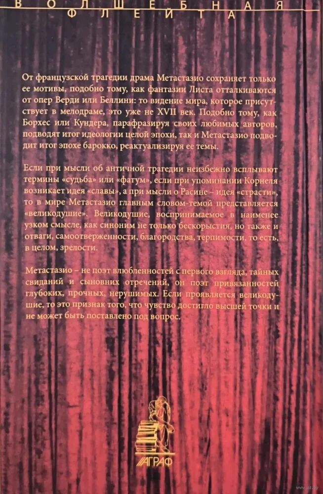 Творчество Метастазио предстает как внушительная вселенная со своими законами и правилами. .В книге дается также краткое содержание основных либретто Метастазио. В качестве примеров творчества приведены переводы одного сонета и одного полного либретто великого итальянского либреттиста. .