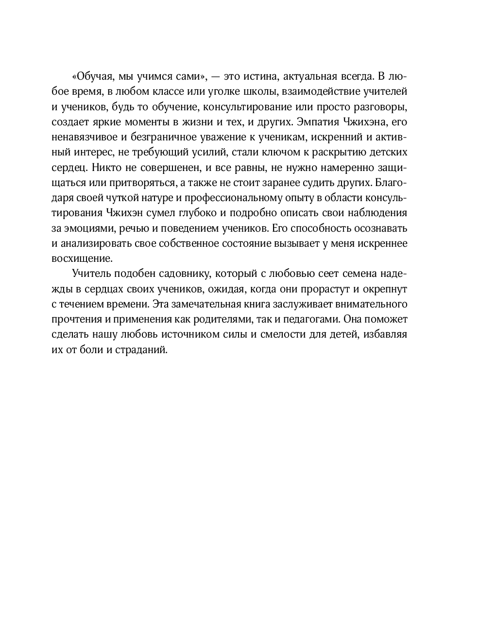 Эта книга – дневник десяти лет наблюдений Чэнь Чжихэна за своими учениками. На примере трогательных историй он показывает, как можно наладить настоящую эмоциональную связь с ребенком – без давления и борьбы. Здесь вы найдете техники "малых бесед" и "внимательного слушания", которые помогут превратить общение с ребенком в доверительный диалог, а дом – в пространство для понимания и поддержки.