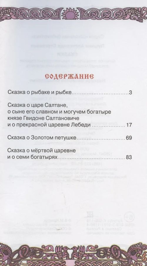 В книгу вошли 4 чудесных и волшебных сказки Александра Сергеевича Пушкина: "Сказка о рыбаке и рыбке", "Сказка о царе Салтане, о сыне его славном и могучем богатыре князе Гвидоне Салтановиче и о прекрасной царевне Лебеди","Сказка о золотом петушке" и "Сказка о мёртвой царевне и о семи богатырях".