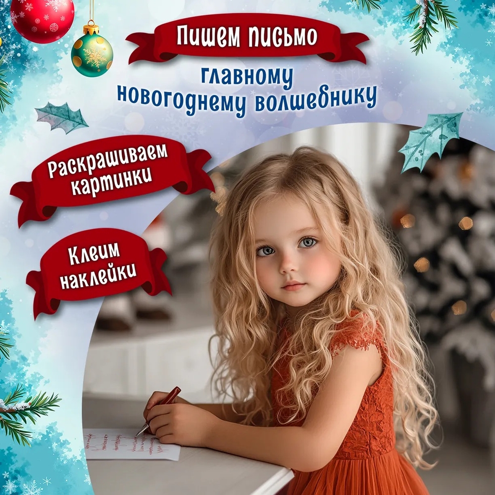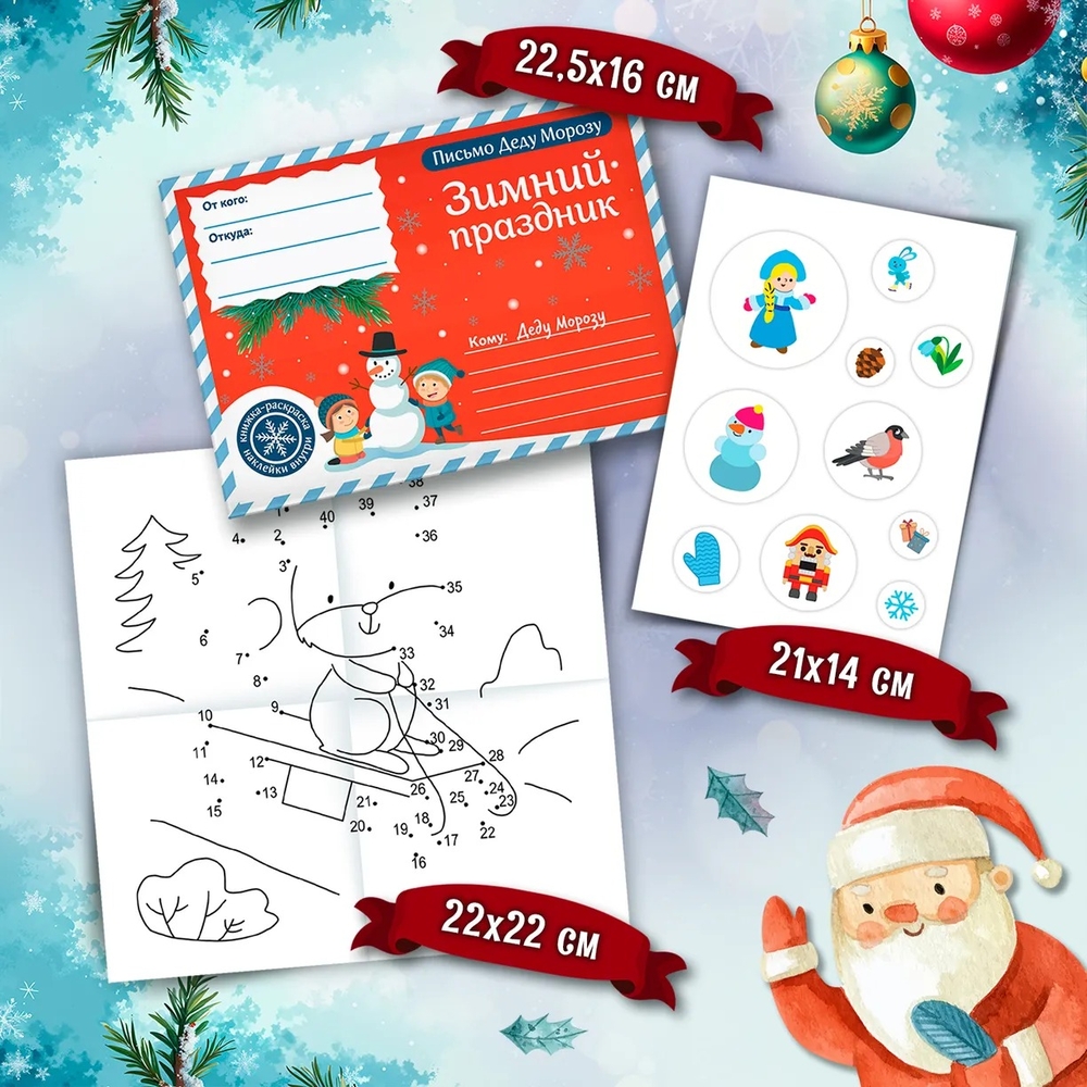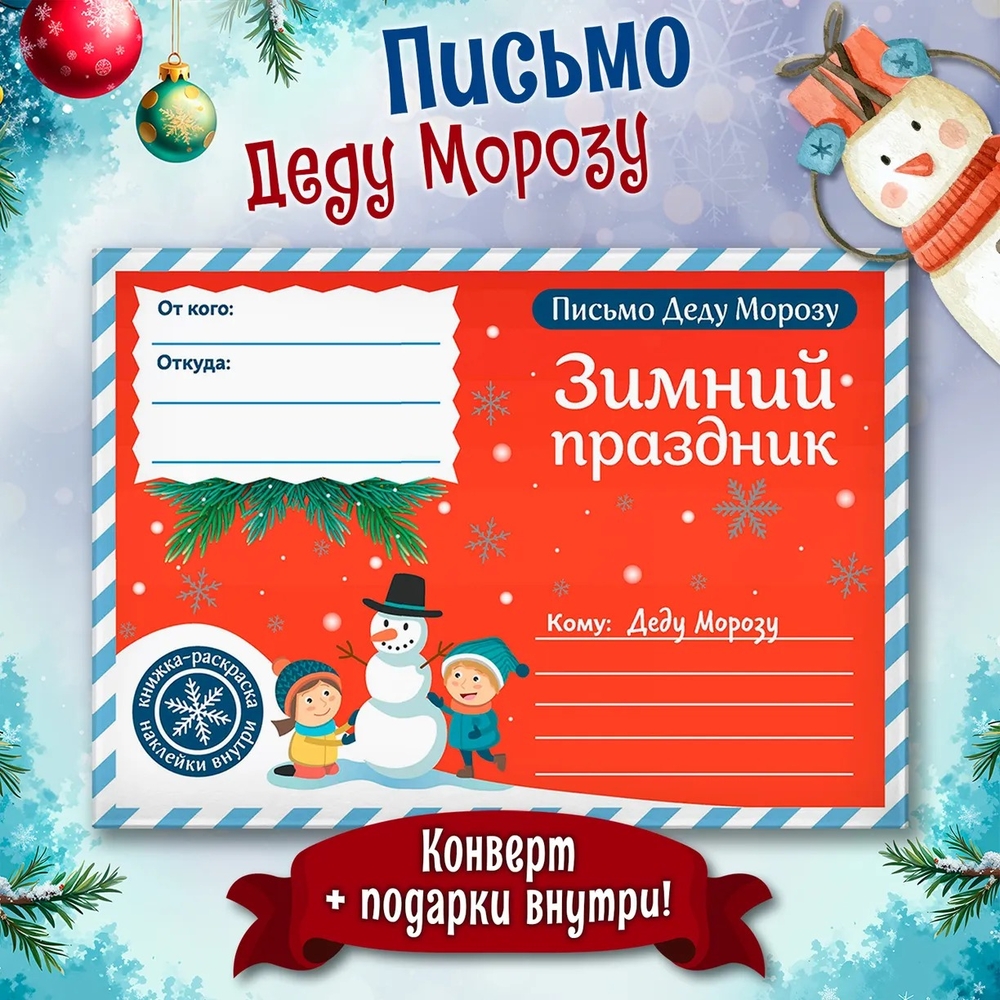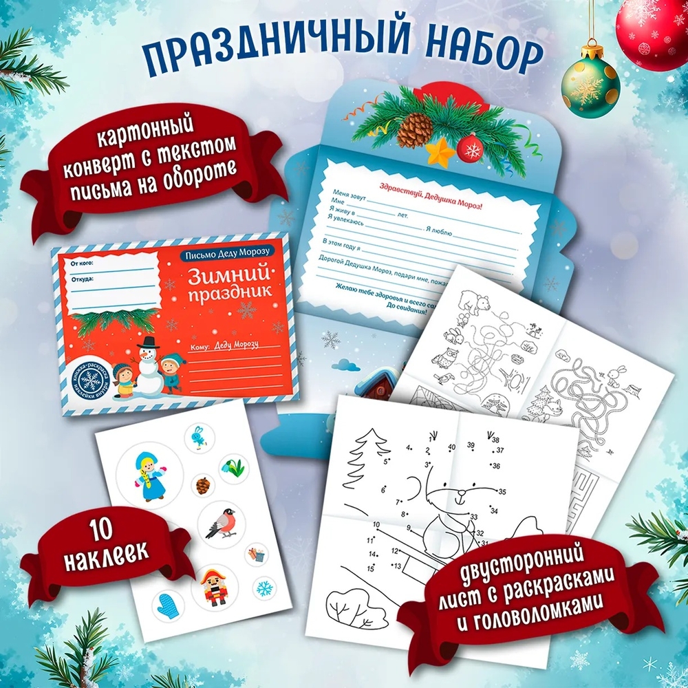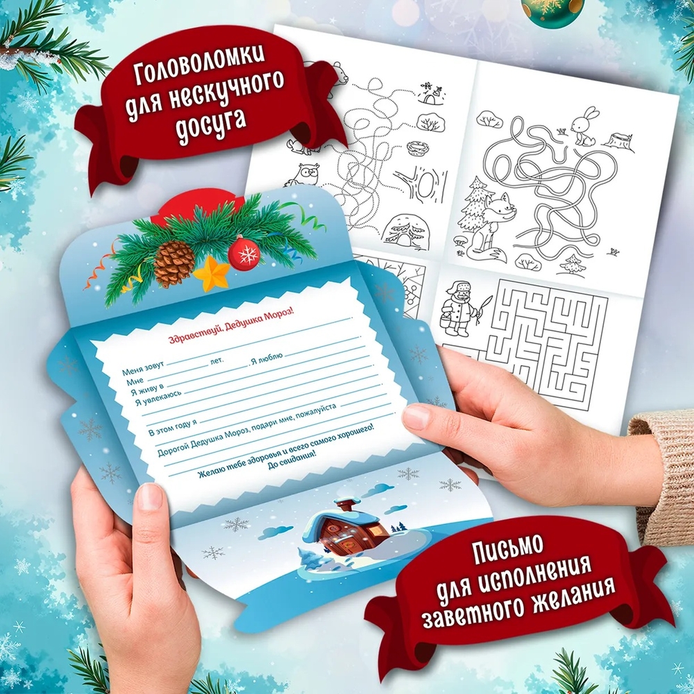 В этом праздничном конверте ты найдёшь увлекательные головоломки, наклейки и раскраски, а также бланк письма самому Деду Морозу! Скорее раскрывай конверт!