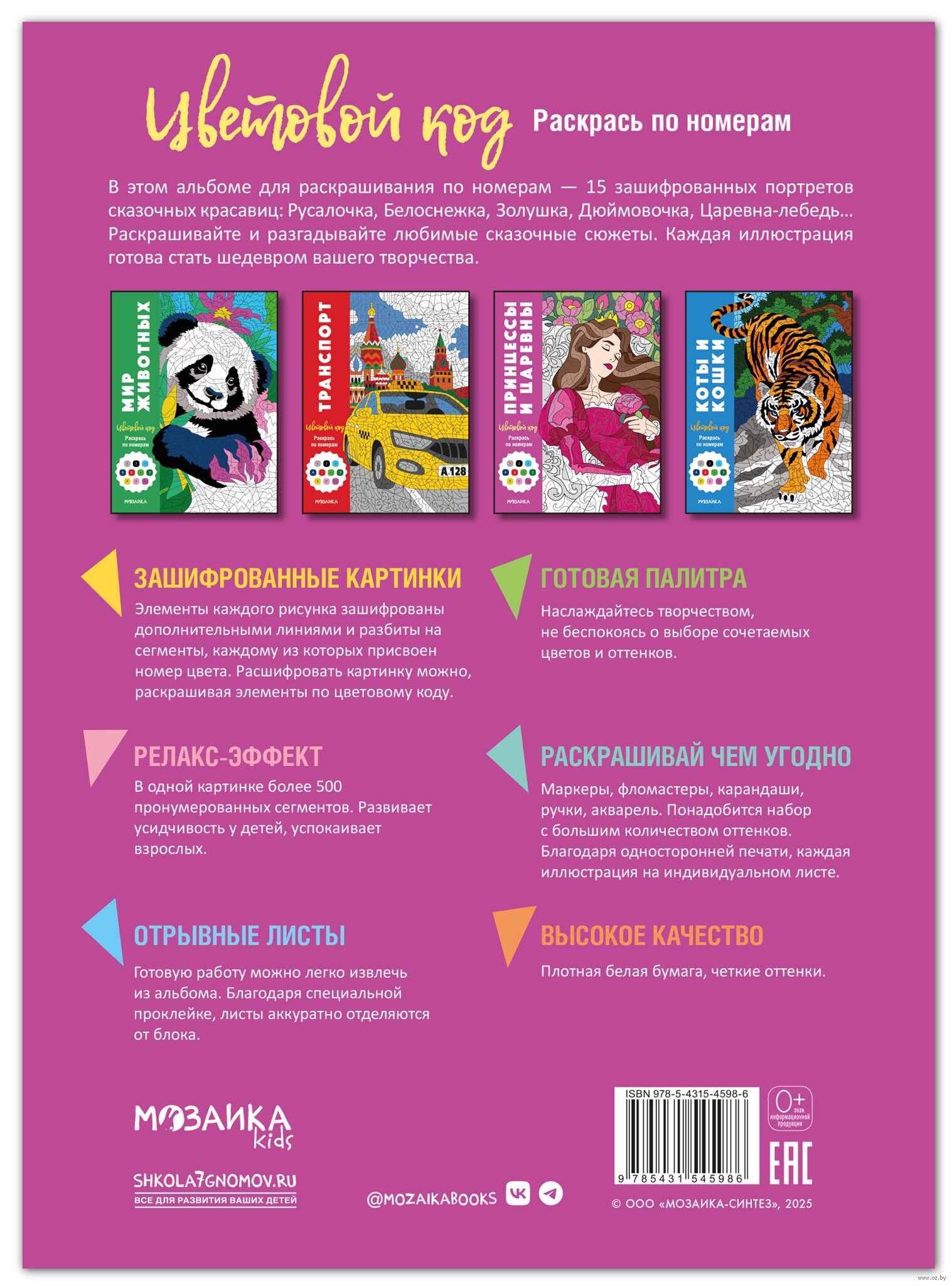 Серия раскрасок "Цветовой код. Раскрась по номерам" представляет собой увлекательный формат творчества для детей и взрослых. Раскраска "Принцессы и царевны" из этой серии приглашает в волшебный мир, где можно раскрыть образы 15 любимых героинь, среди которых Русалочка, Дюймовочка, Золушка, Белоснежка и другие. Каждое изображение зашифровано сеткой линий и разбито на множество пронумерованных сегментов. Процесс расшифровки цветового кода позволяет шаг за шагом проявлять скрытую картину, погружаясь в медитативное творчество.