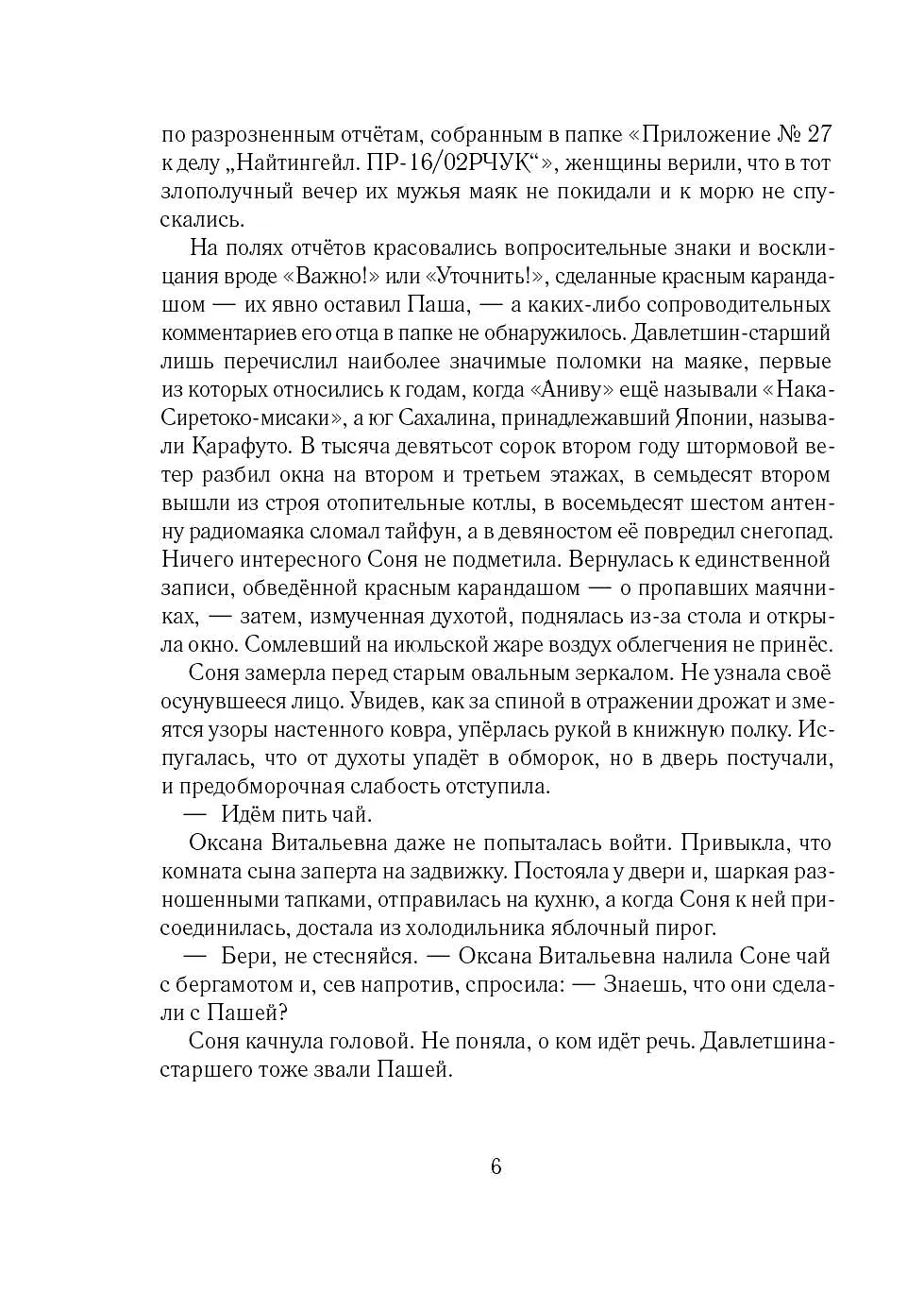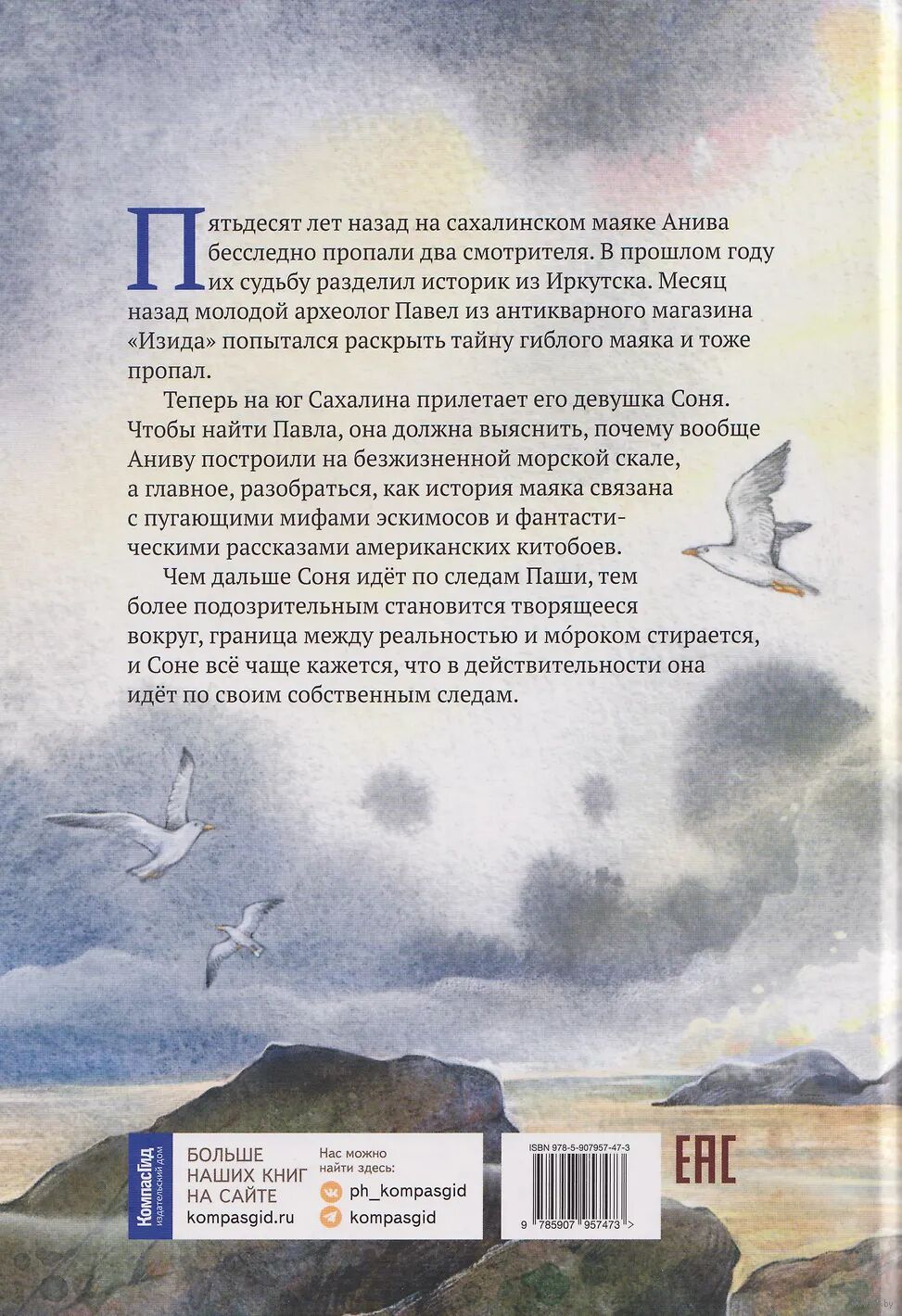 Пятьдесят лет назад на сахалинском маяке Анива бесследно пропали два смотрителя. В прошлом году их судьбу разделил историк из Иркутска. Месяц назад молодой археолог Павел из антикварного магазина "Изида" попытался раскрыть тайну гиблого маяка и тоже пропал. Теперь на юг Сахалина прилетает его девушка Соня. Чтобы найти Павла, она должна выяснить, почему вообще Аниву построили на безжизненной морской скале, а главное, разобраться, как история маяка связана с пугающими мифами эскимосов и фантастическими рассказами американских китобоев. Чем дальше Соня идёт по следам Паши, тем более подозрительным становится творящееся вокруг, граница между реальностью и мороком стирается, и Соне всё чаще кажется, что в действительности она идёт по своим собственным следам.