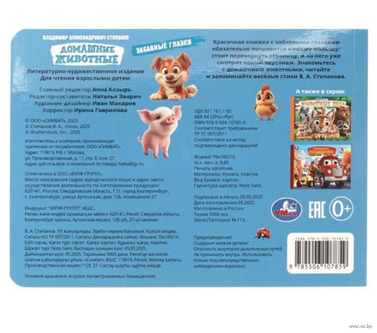 Яркая книга со стихами Владимира Степанова об обитателях фермы непременно заинтересует ребёнка. Большие яркие картинки, интересные стихи и объёмные глазки, благодаря которым персонаж на обложке выглядит совсем как живой, не оставят равнодушным маленького читателя и подарят ему много весёлых и увлекательных минут игры с этой книгой. Компактный размер издания позволяет взять её с собой даже в путешествие.
