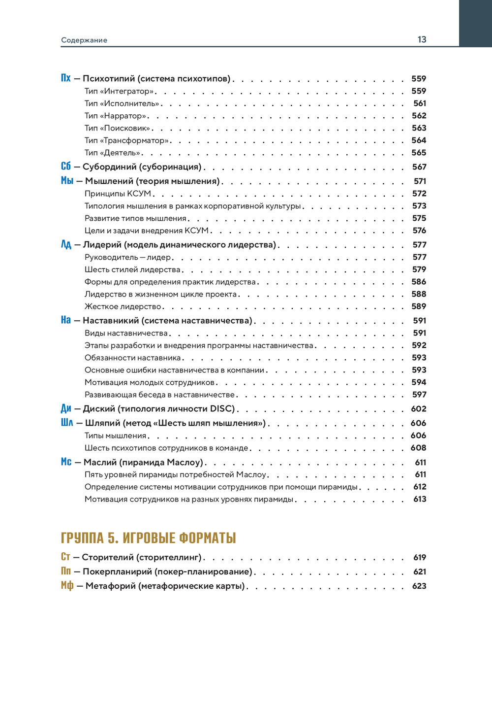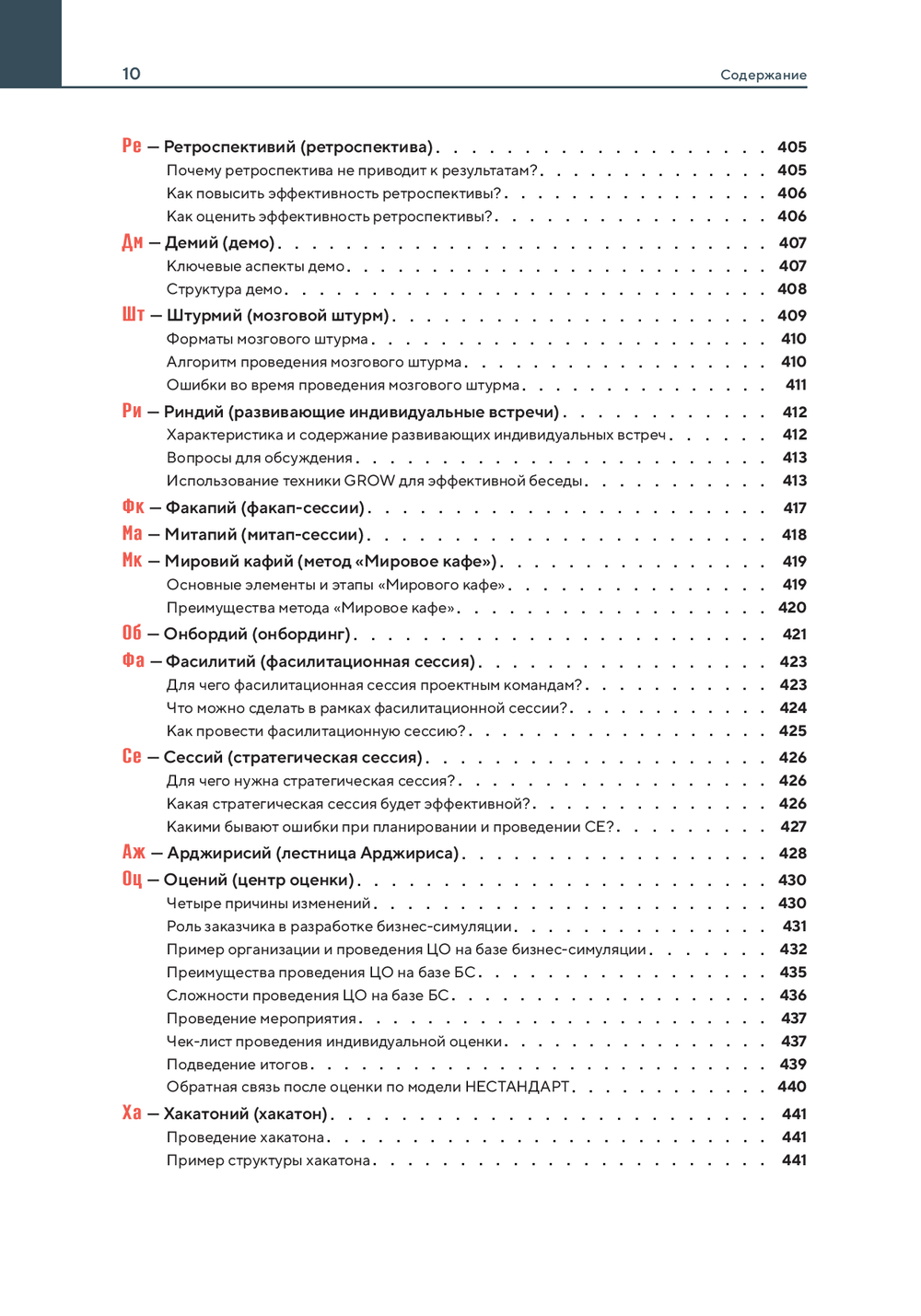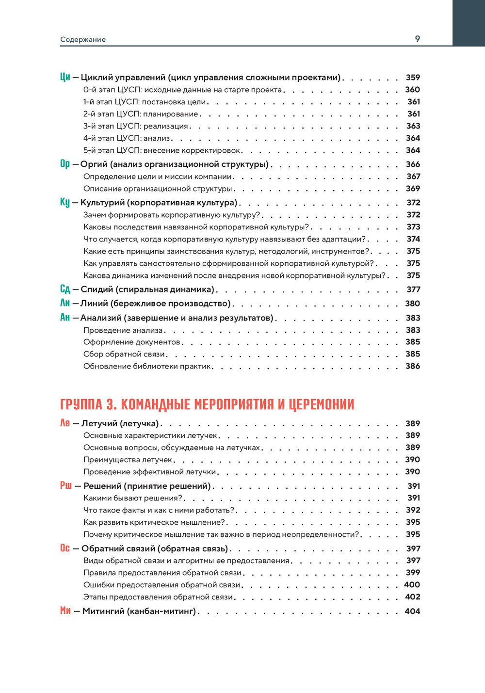 Книга разделена на пять тематических групп инструментов с контрастной цветовой кодировкой: "Проектные инструменты", "Подходы и методы", "Командные мероприятия и церемонии", "Психологические инструменты", и "Игровые форматы". В приложениях приведены алфавитные списки инструментов для удобства навигации, рабочие шаблоны с возможностью скачивания, список литературы для углубленного изучения.