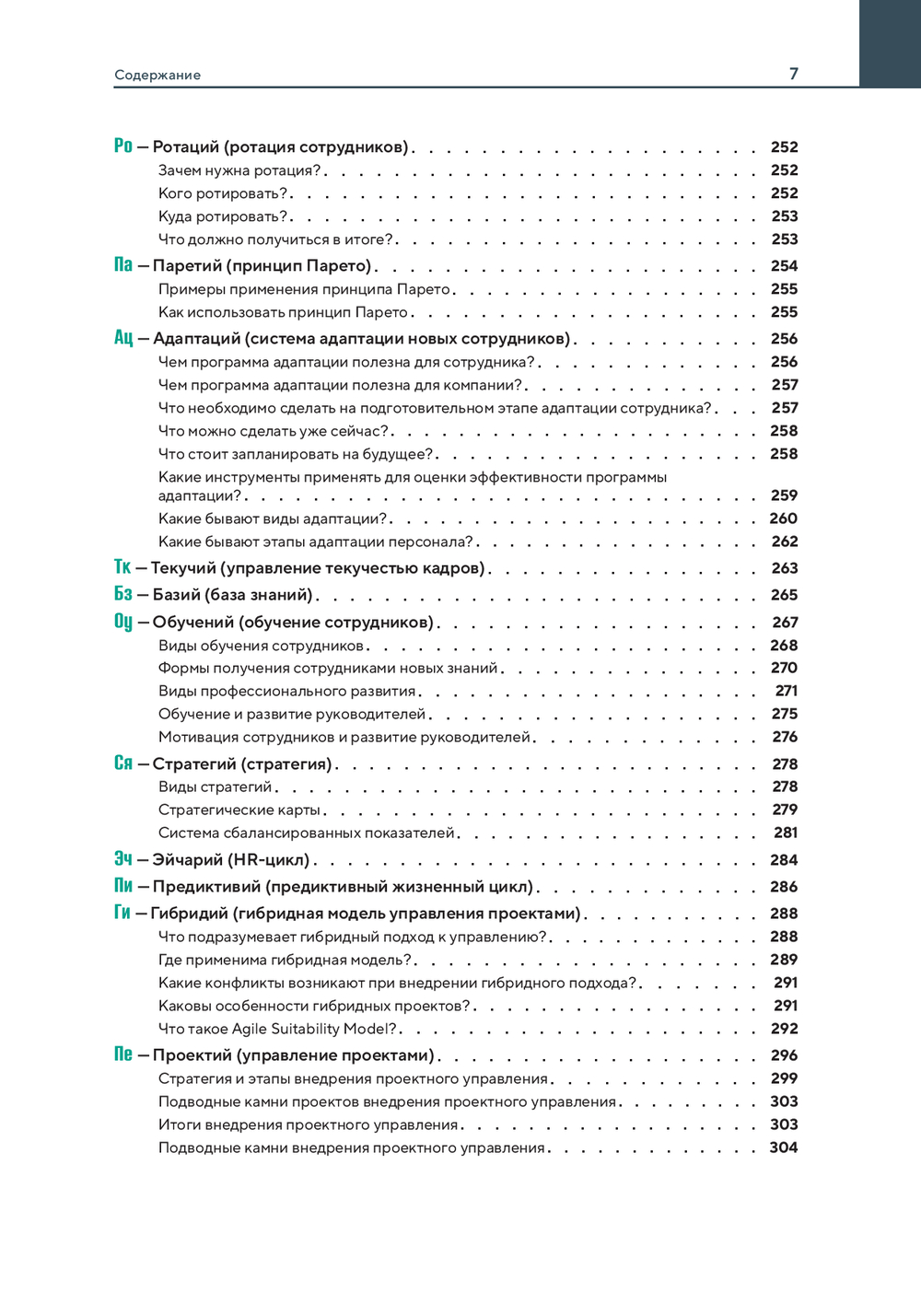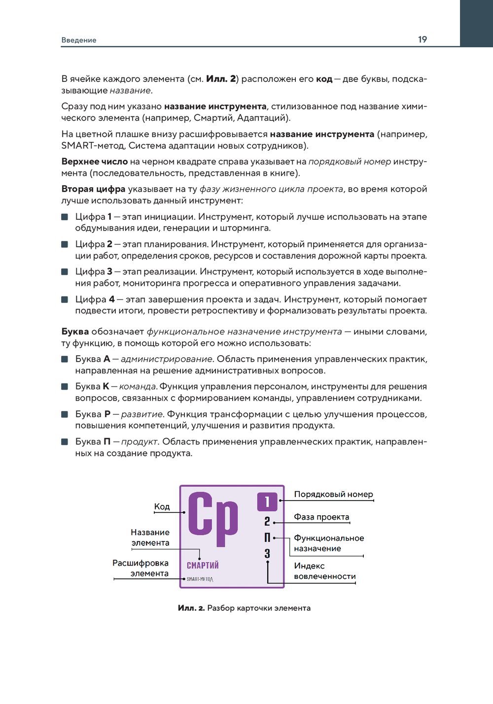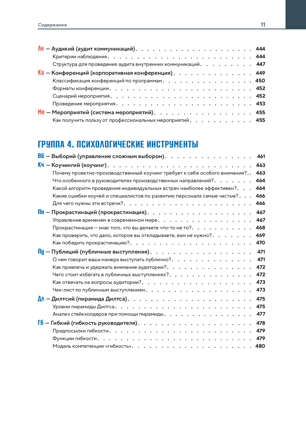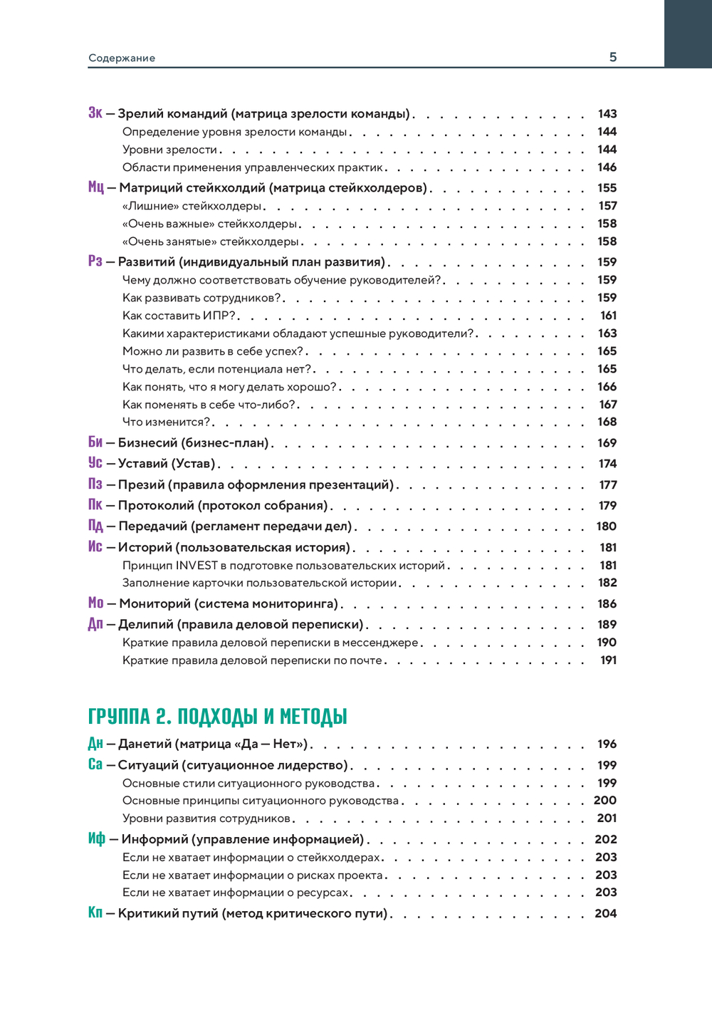 Книга разделена на пять тематических групп инструментов с контрастной цветовой кодировкой: "Проектные инструменты", "Подходы и методы", "Командные мероприятия и церемонии", "Психологические инструменты", и "Игровые форматы". В приложениях приведены алфавитные списки инструментов для удобства навигации, рабочие шаблоны с возможностью скачивания, список литературы для углубленного изучения.