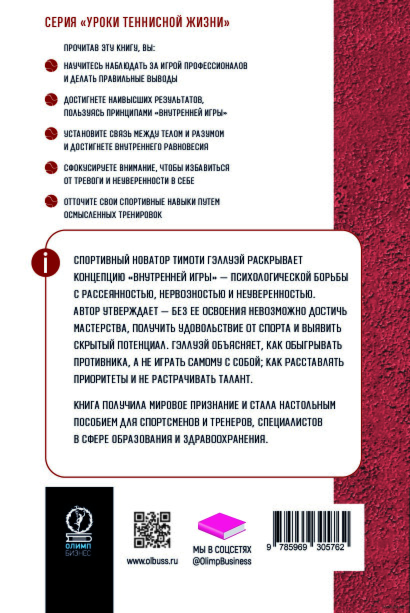 Тимоти У. Гэллуэй утверждает: вы не добьетесь ни в какой игре ни совершенства, ни радости, если не обратите должного внимания на неприметные хитрости "внутренней игры", цель которой – раскрытие и реализация потенциала, кроющегося внутри вашего тела.