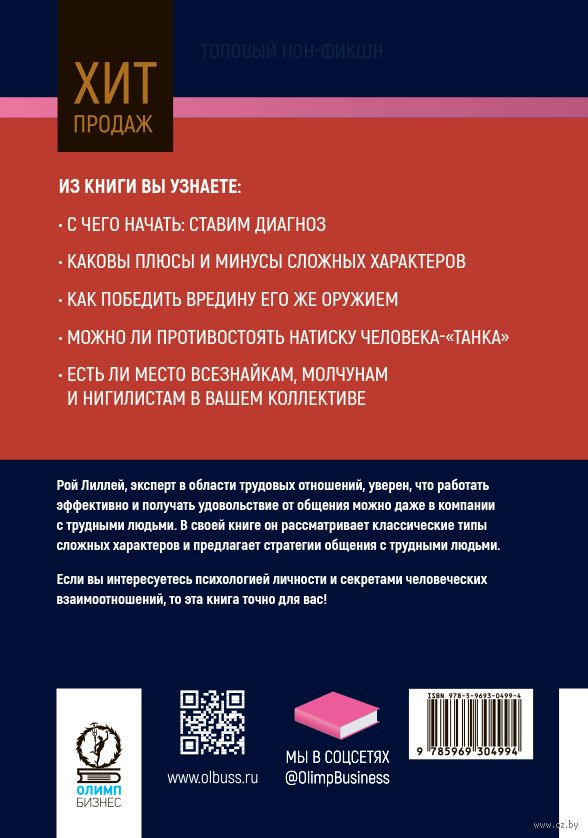 Рой Лиллей, эксперт в области трудовых отношений, уверен, что работать эффективно и получать удовольствие от общения можно даже в компании с трудными людьми. В своей книге он рассматривает классические типы сложных характеров и предлагает стратегии общения с трудными людьми.