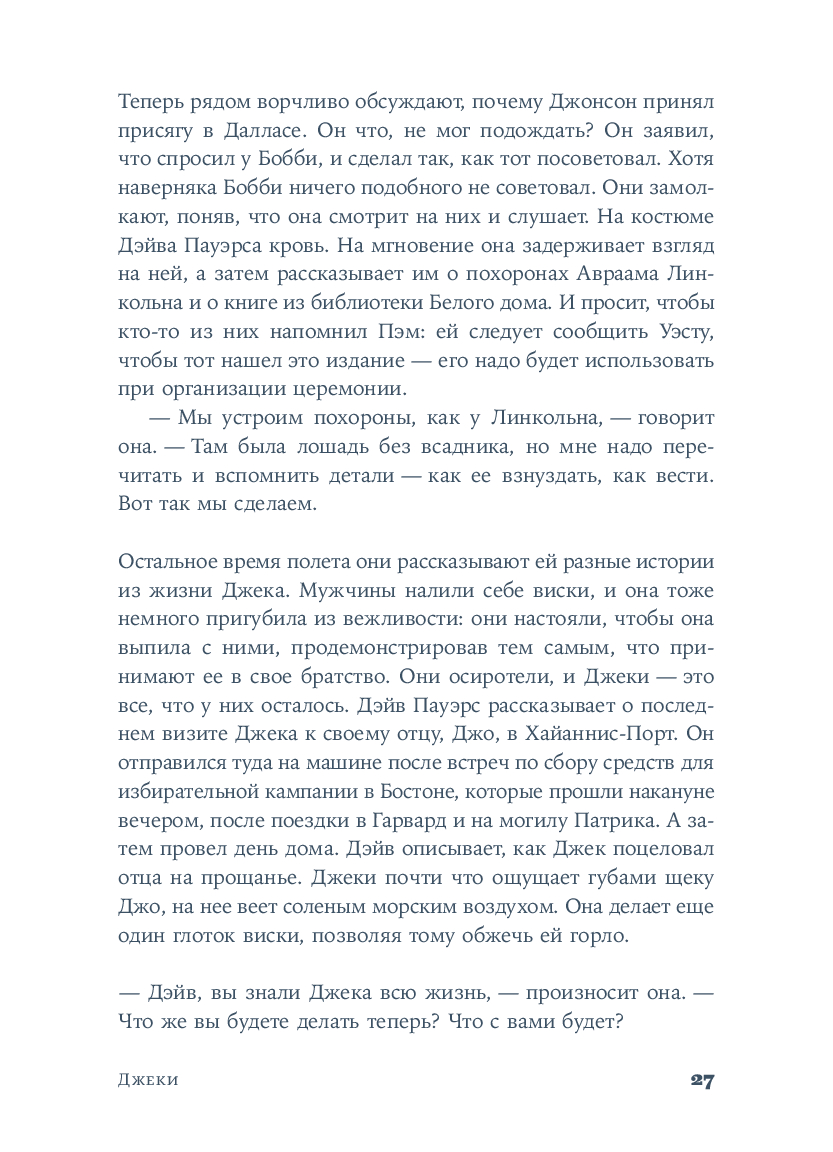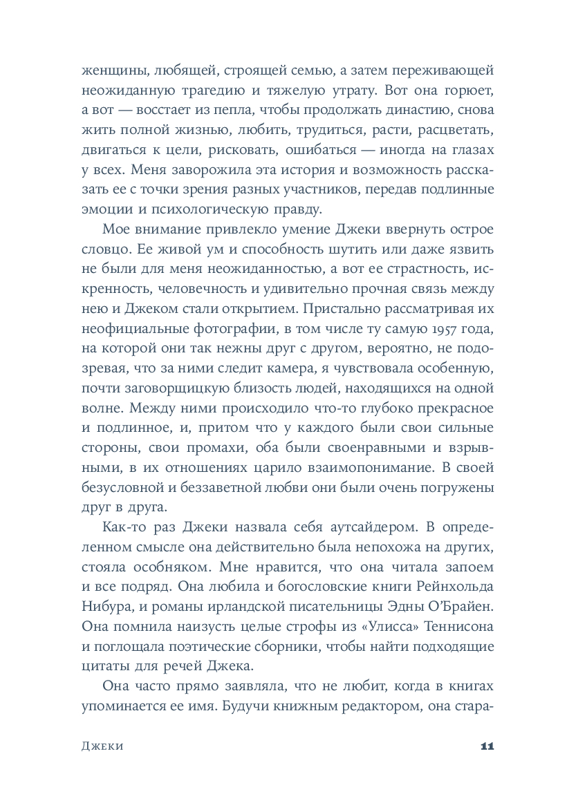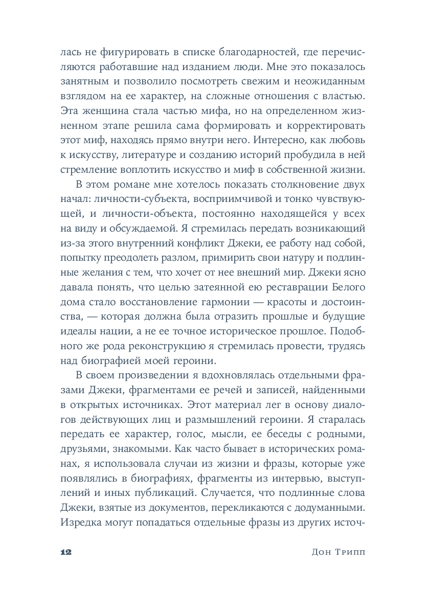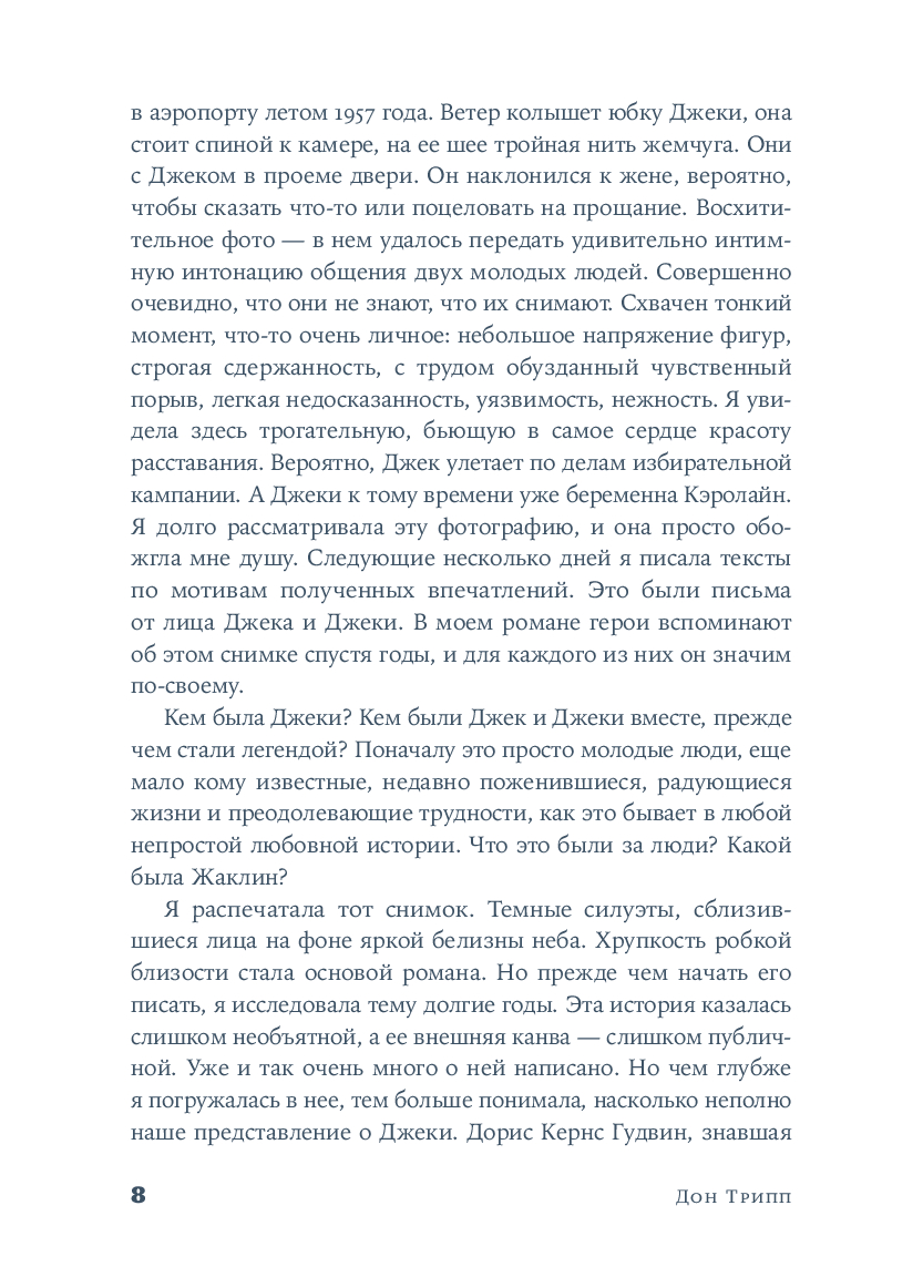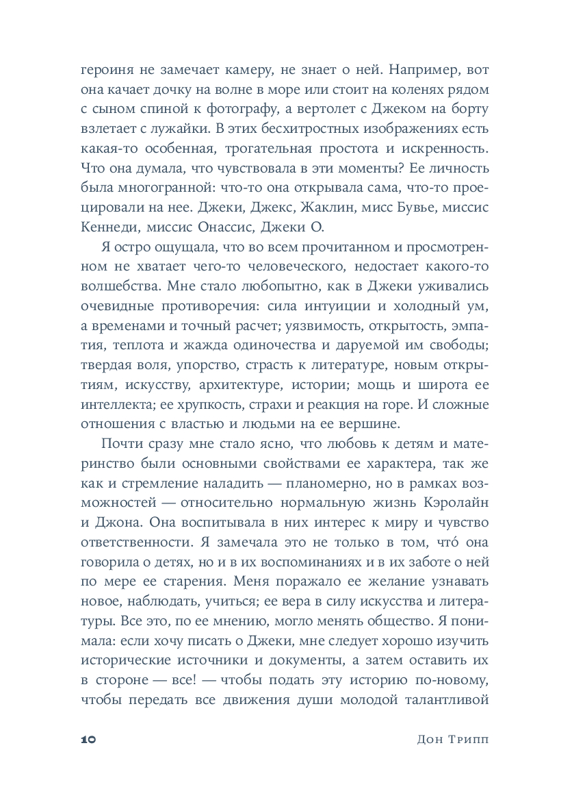 Опираясь на многочисленные документы и свидетельства о жизни героини, Дон Трипп то и дело отходит от них, чтобы дать слово самой Джеки и исследовать ее внутренний мир. Это повествование о боли утрат и внутренней силе, о браке и трагедии, которая перечеркнула всё, и о том, как Жаклин стремилась сохранить себя. Но прежде всего это роман о многогранной личности, которую невозможно свести к одной роли: Джеки, Джекс, мисс Бувье, миссис Кеннеди. "Все эти имена важны, – говорит героиня, – но ни одно не описывает меня полностью".