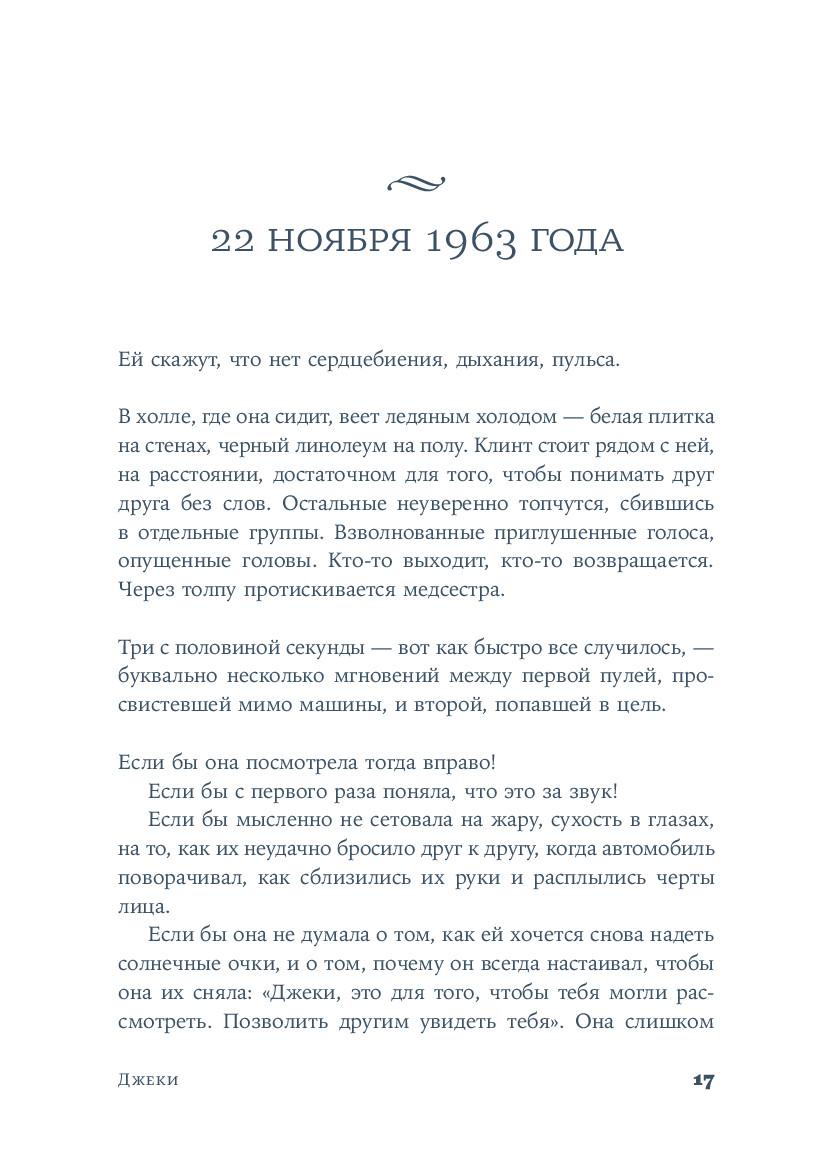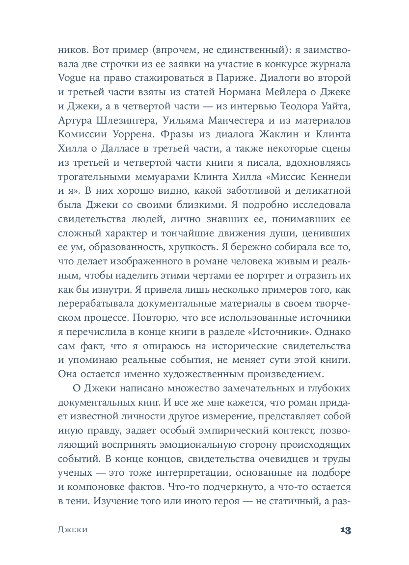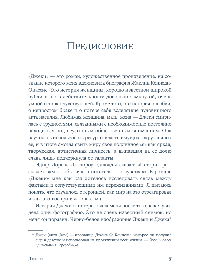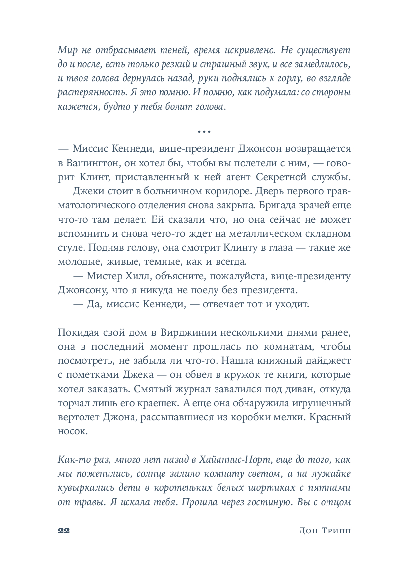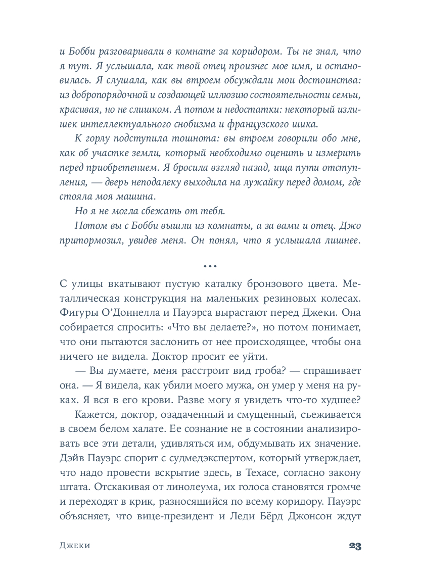 Опираясь на многочисленные документы и свидетельства о жизни героини, Дон Трипп то и дело отходит от них, чтобы дать слово самой Джеки и исследовать ее внутренний мир. Это повествование о боли утрат и внутренней силе, о браке и трагедии, которая перечеркнула всё, и о том, как Жаклин стремилась сохранить себя. Но прежде всего это роман о многогранной личности, которую невозможно свести к одной роли: Джеки, Джекс, мисс Бувье, миссис Кеннеди. "Все эти имена важны, – говорит героиня, – но ни одно не описывает меня полностью".