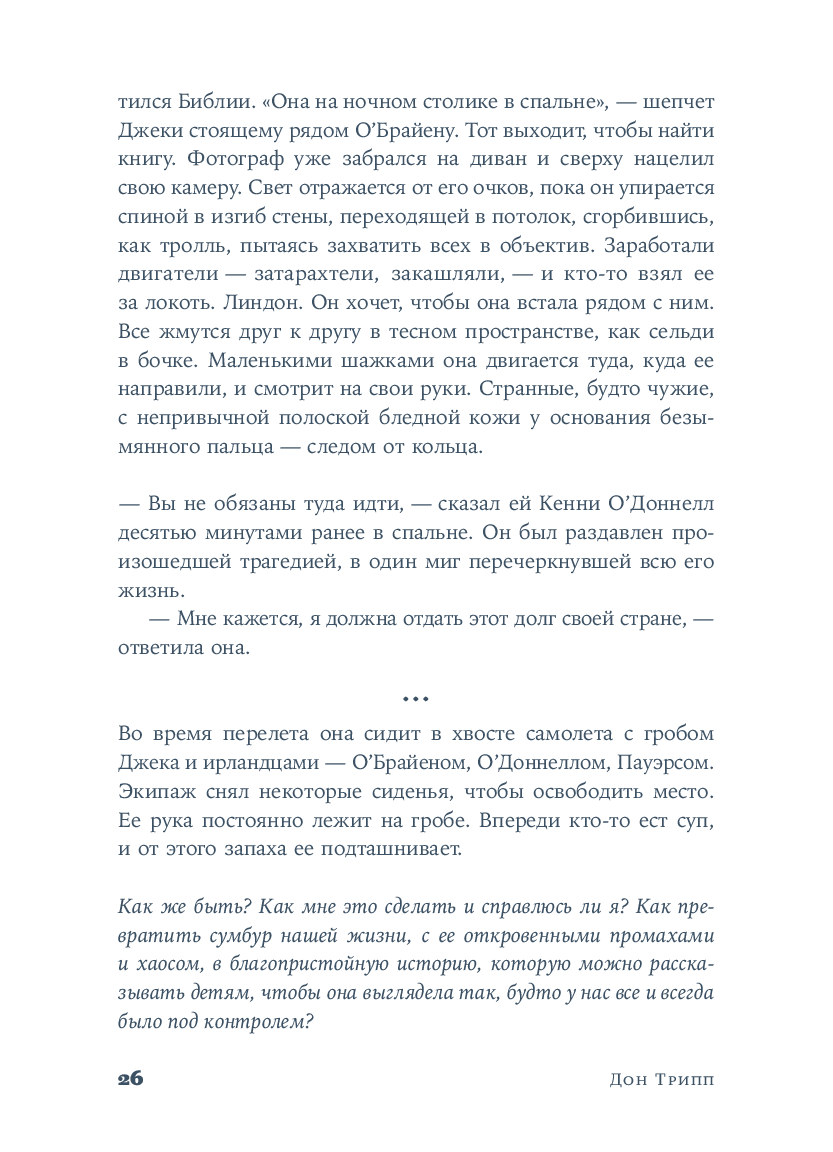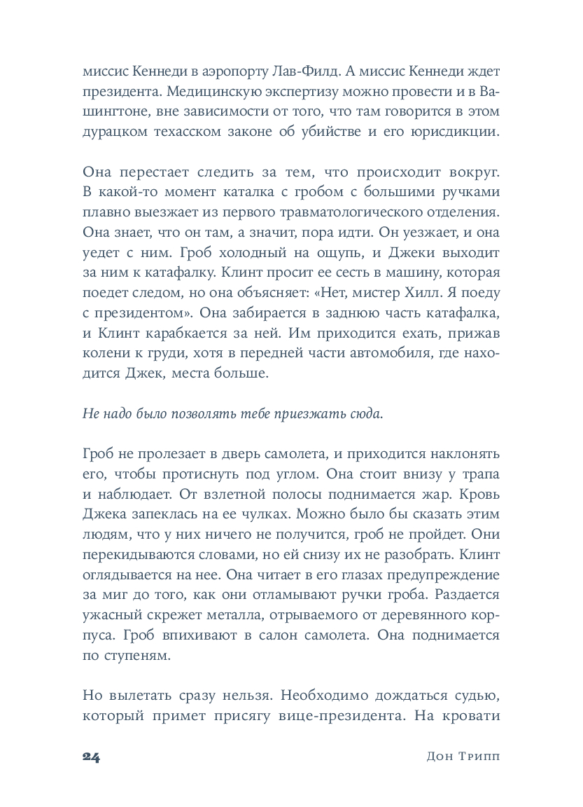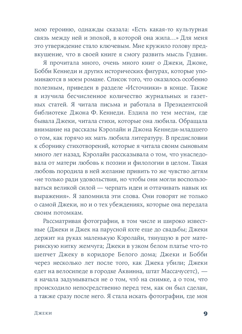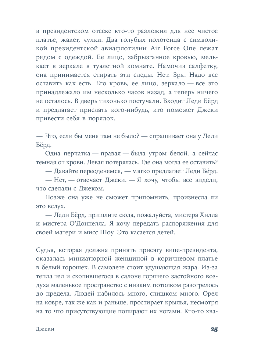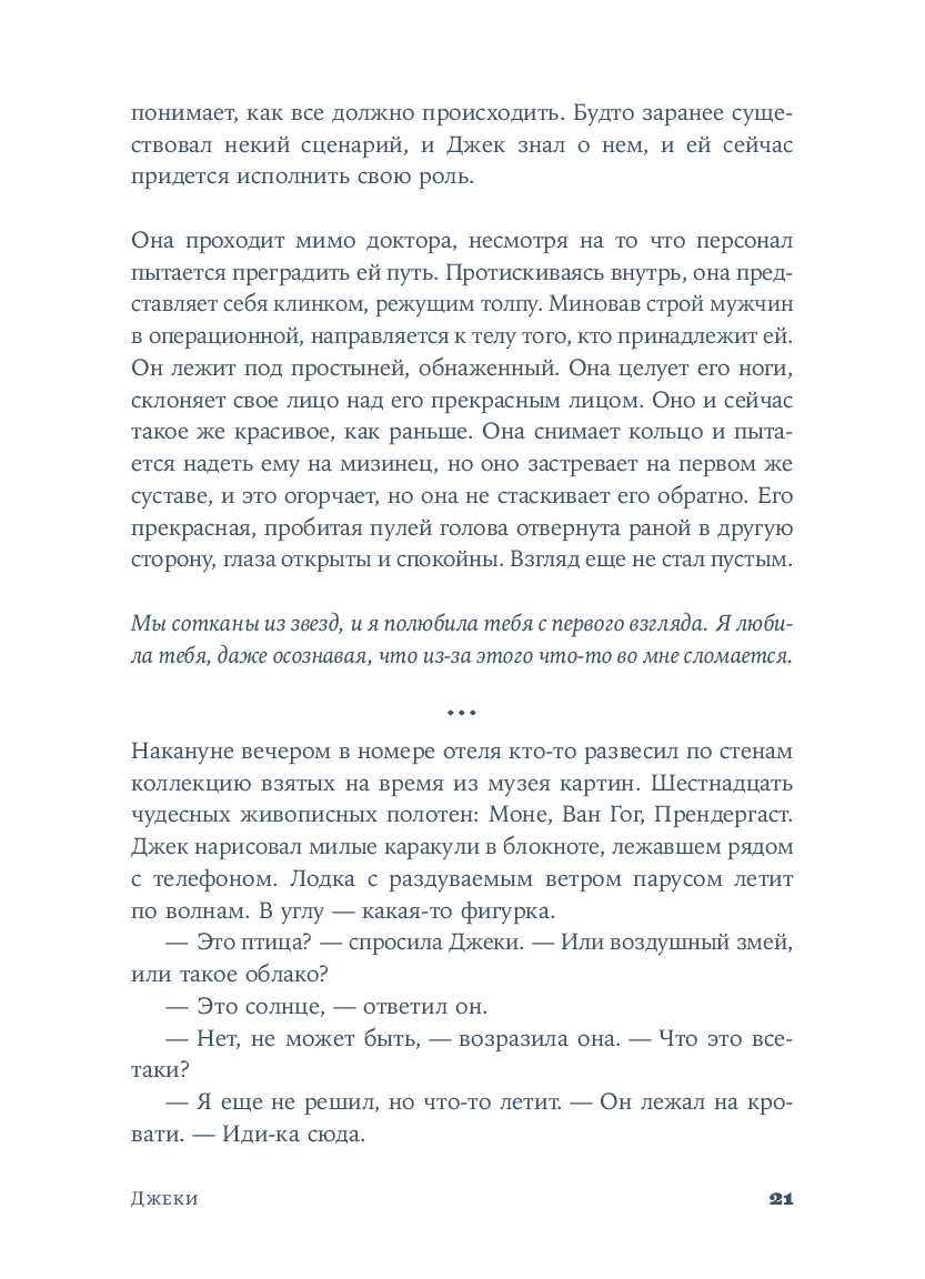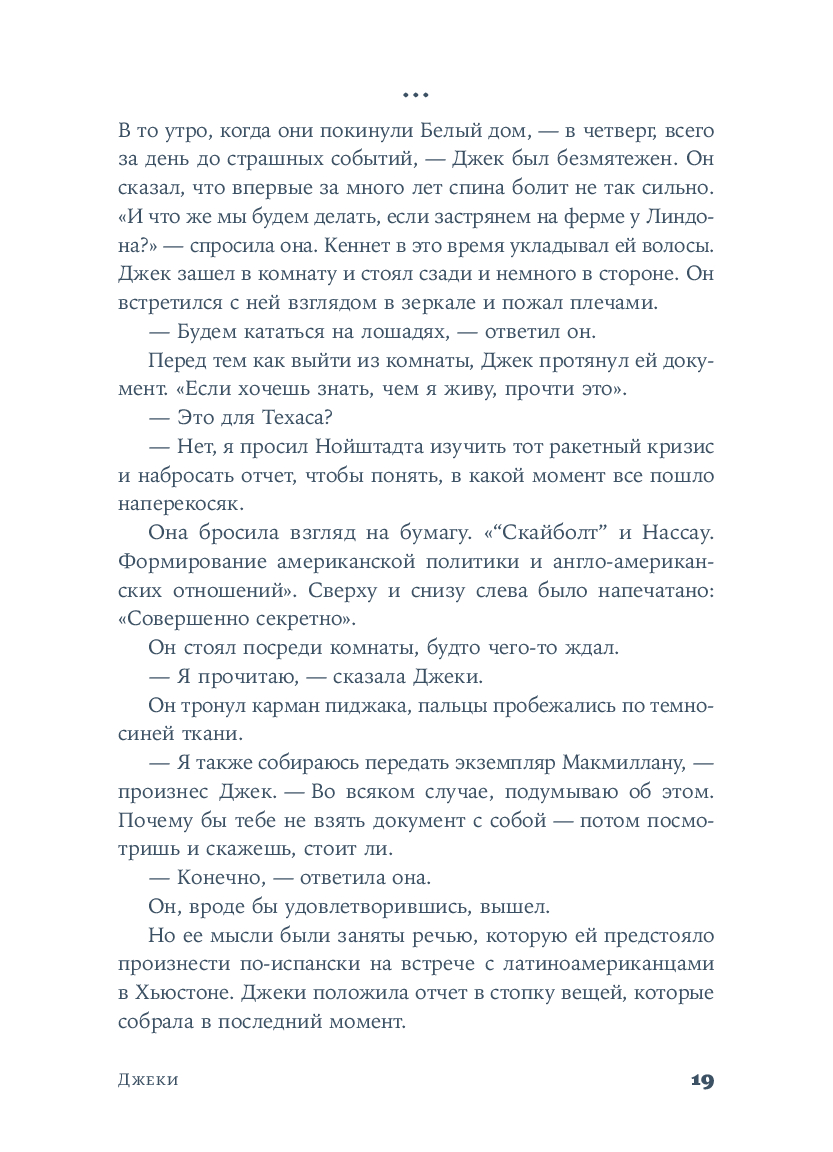 Опираясь на многочисленные документы и свидетельства о жизни героини, Дон Трипп то и дело отходит от них, чтобы дать слово самой Джеки и исследовать ее внутренний мир. Это повествование о боли утрат и внутренней силе, о браке и трагедии, которая перечеркнула всё, и о том, как Жаклин стремилась сохранить себя. Но прежде всего это роман о многогранной личности, которую невозможно свести к одной роли: Джеки, Джекс, мисс Бувье, миссис Кеннеди. "Все эти имена важны, – говорит героиня, – но ни одно не описывает меня полностью".