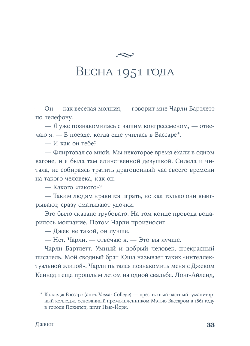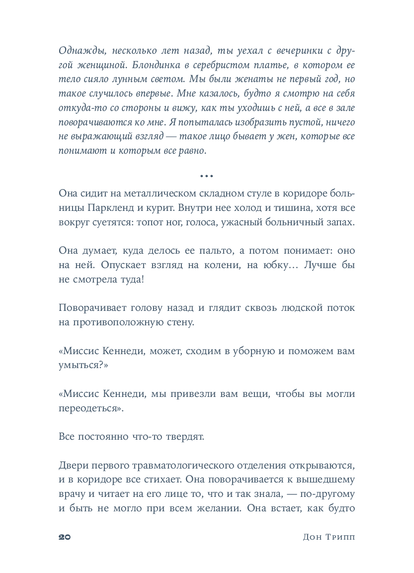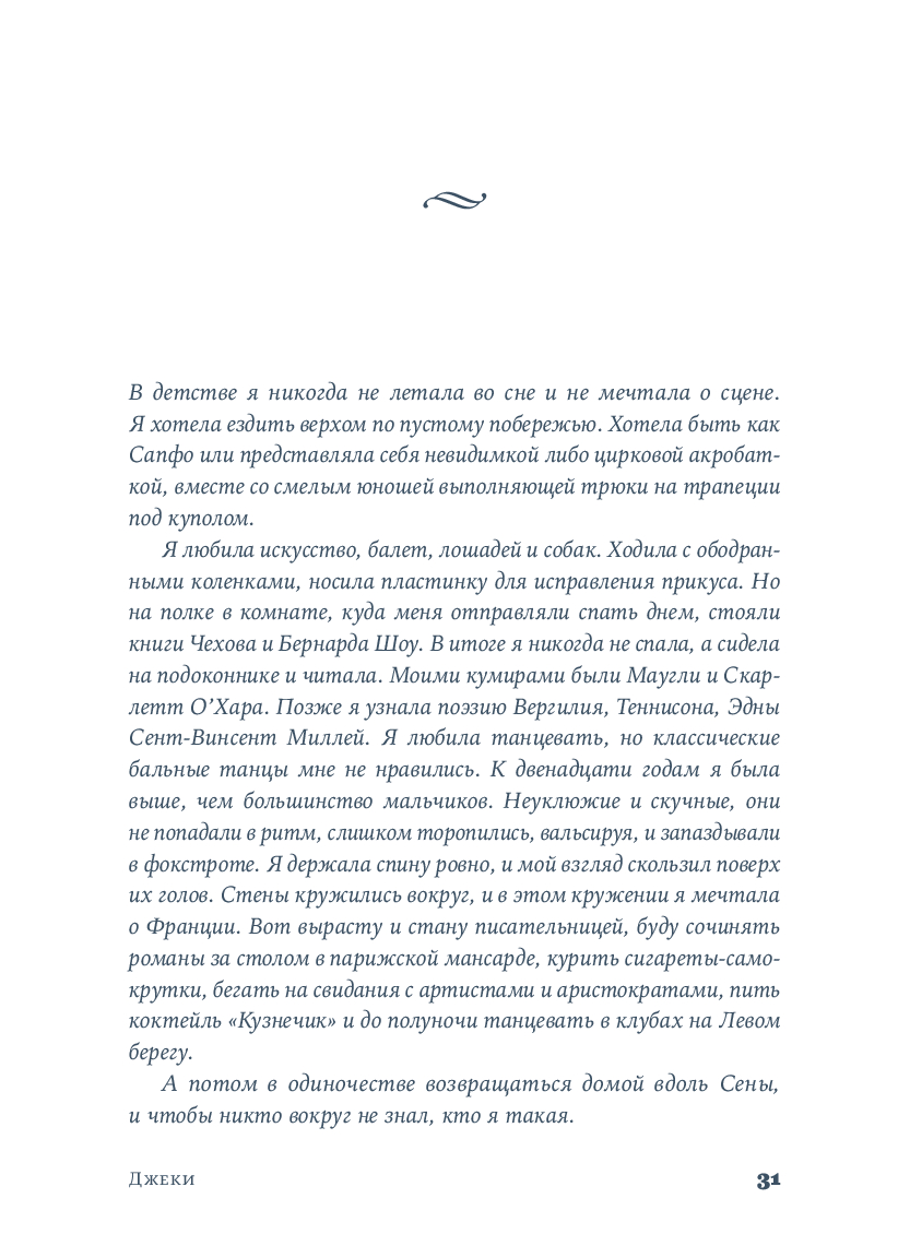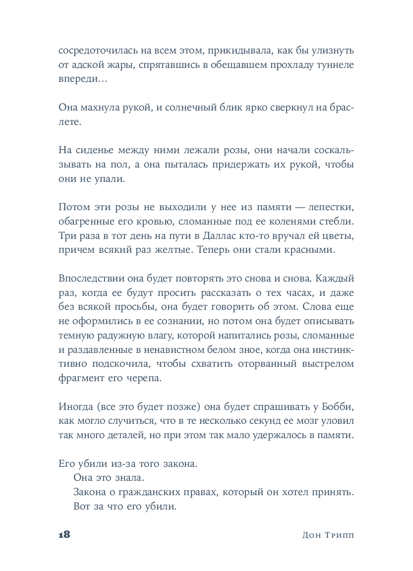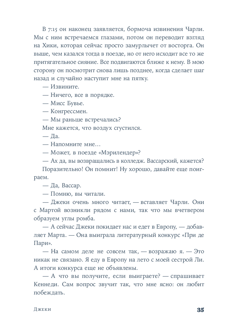 Опираясь на многочисленные документы и свидетельства о жизни героини, Дон Трипп то и дело отходит от них, чтобы дать слово самой Джеки и исследовать ее внутренний мир. Это повествование о боли утрат и внутренней силе, о браке и трагедии, которая перечеркнула всё, и о том, как Жаклин стремилась сохранить себя. Но прежде всего это роман о многогранной личности, которую невозможно свести к одной роли: Джеки, Джекс, мисс Бувье, миссис Кеннеди. "Все эти имена важны, – говорит героиня, – но ни одно не описывает меня полностью".
