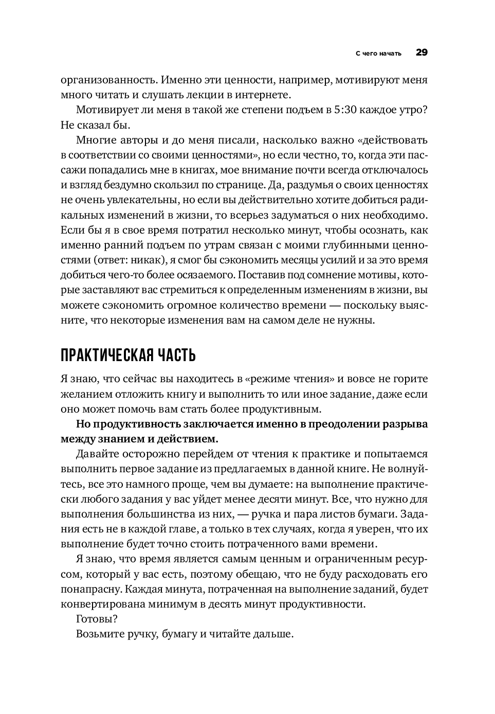 Для своей книги Крис Бэйли отобрал 25 самых лучших способов повысить продуктивность, которые помогли ему самому. Предложенные методики подробно изложены и представляют собой стройную и последовательную систему саморазвития. Воспользовавшись ею, вы перестанете откладывать важные дела на потом, разгребете завалы дел, научитесь расставлять приоритеты и добиваться целей.