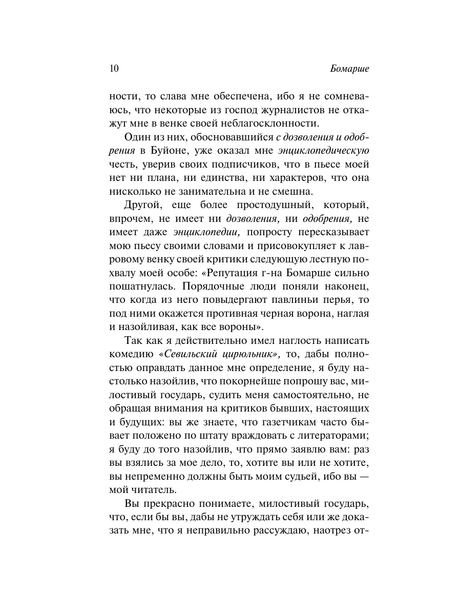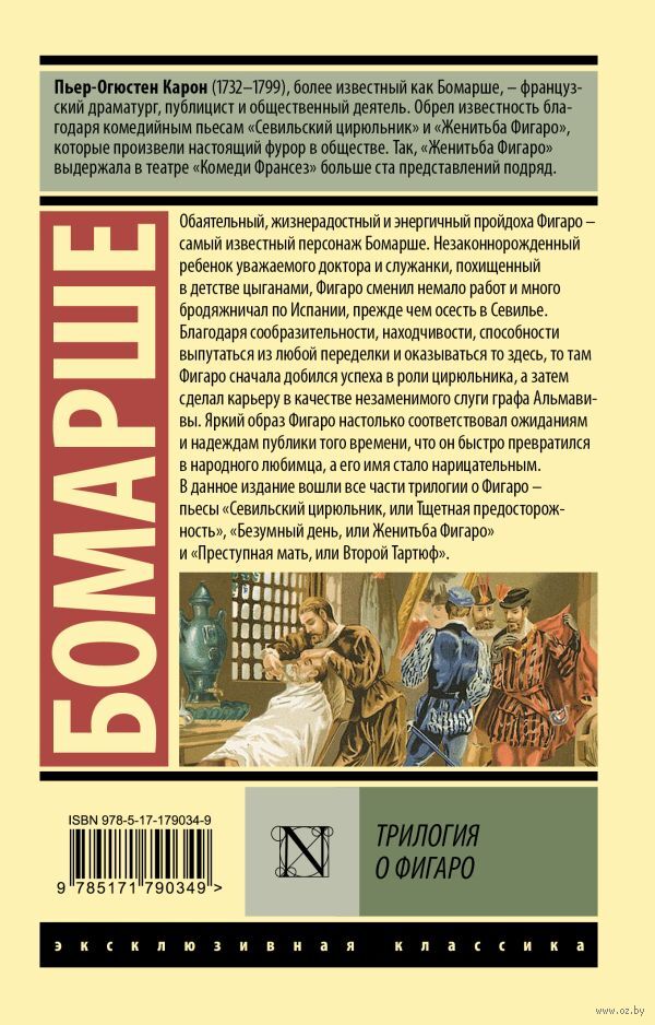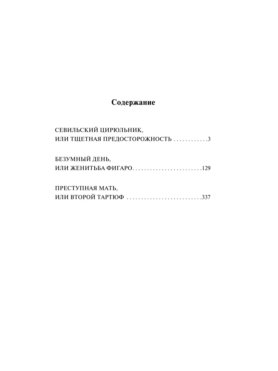 В данное издание вошли все части трилогии о Фигаро – пьесы "Севильский цирюльник, или Тщетная предосторожность", "Безумный день, или Женитьба Фигаро" и "Преступная мать, или Второй Тартюф".