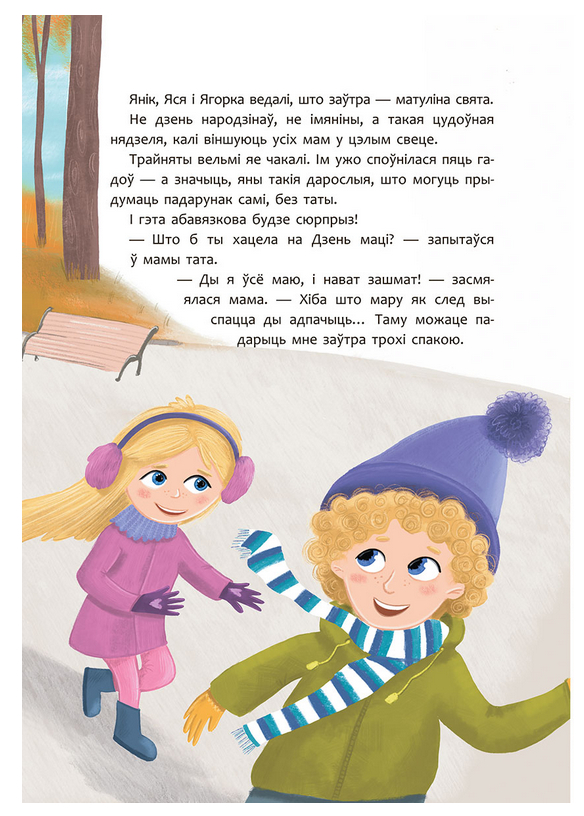 Трайняты Янік, Яся і Ягорка ведаюць, што заўтра – матуліна свята. Ім споўнілася пяць, а значыць, яны ўжо дарослыя і могуць самастойна прыдумаць, што падараваць сваёй маме. "Я ўсё маю, і нават зашмат, – сказала яна. – Хіба што мару як след выспацца ды адпачыць... Таму можаце падарыць мне заўтра трохі спакою". Прапанова выдатная, толькі што такое спакой і дзе яго знайсці?