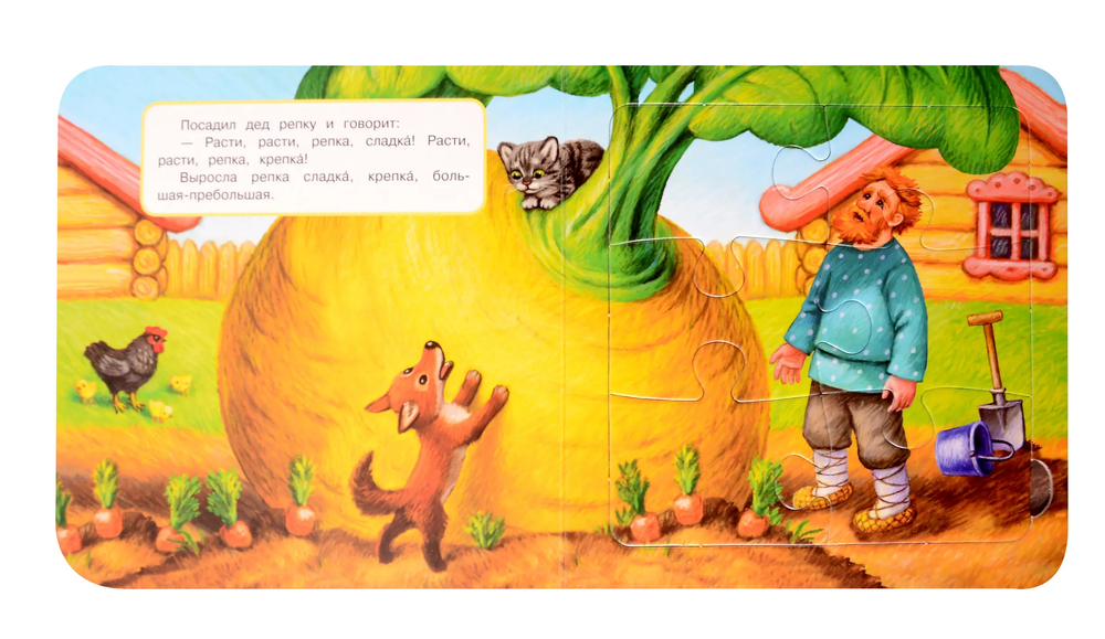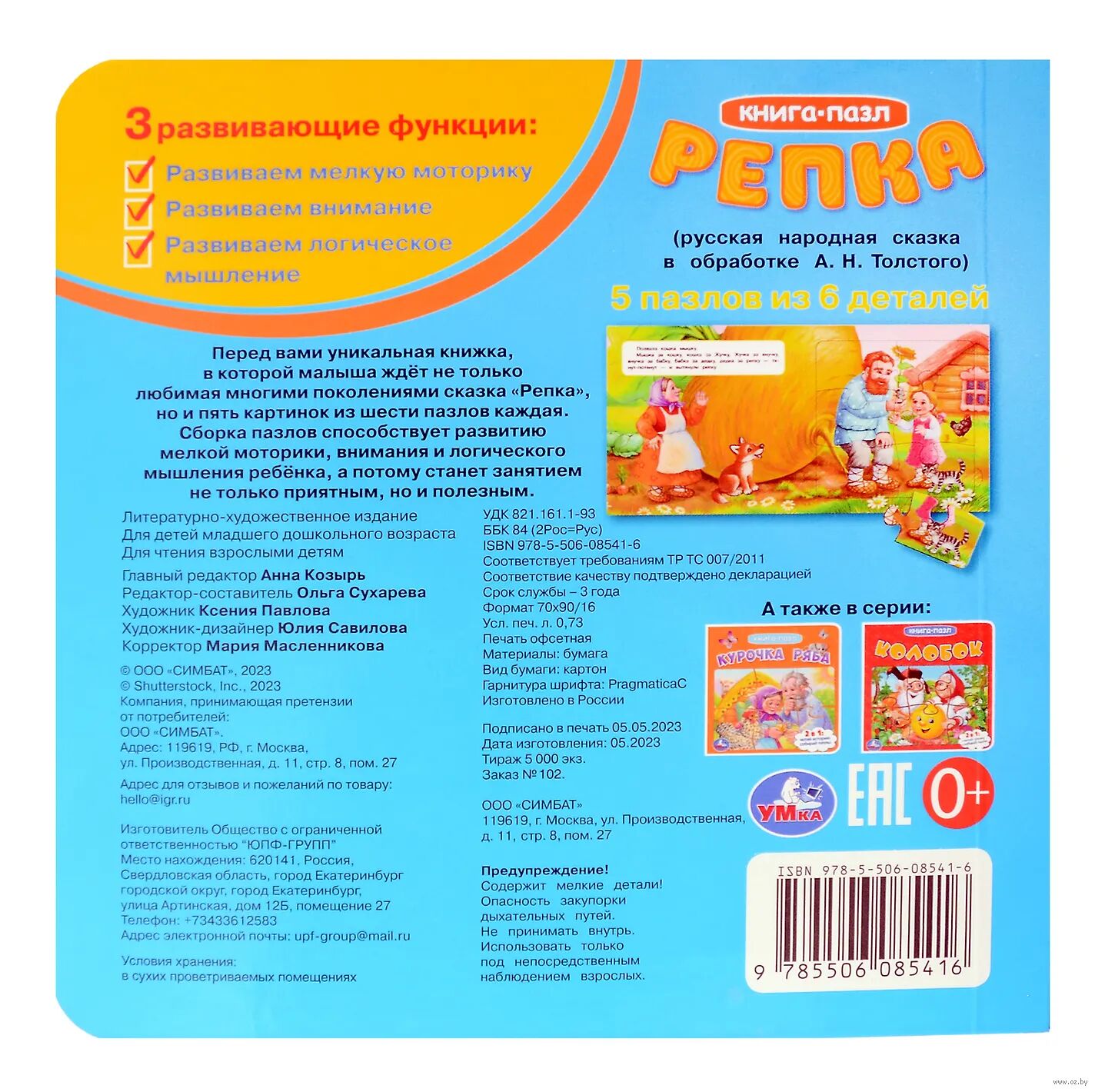 Книга-пазл станет прекрасным подарком для малыша. Данная книга выполняет сразу 2 функции: это и книга для чтения, и игра в пазлы. На каждом развороте малыша ждёт интересное повествование, а также яркий пазл из 6 деталей с изображением сказочных персонажей. Книжка изготовлена из плотного картона, поэтому мамы могут не опасаться, что ребёнок порвёт странички. Благодаря удобному формату книгу можно взять с собой в дорогу.