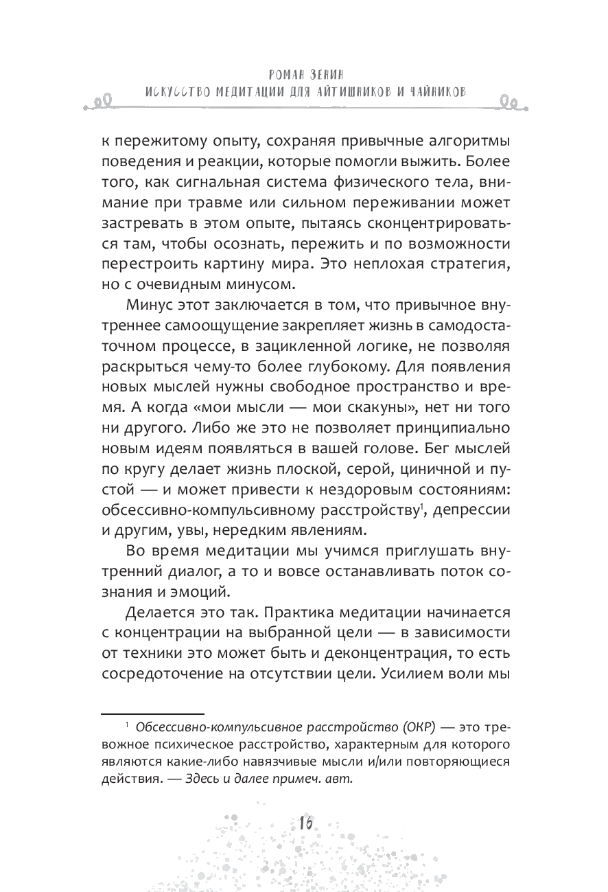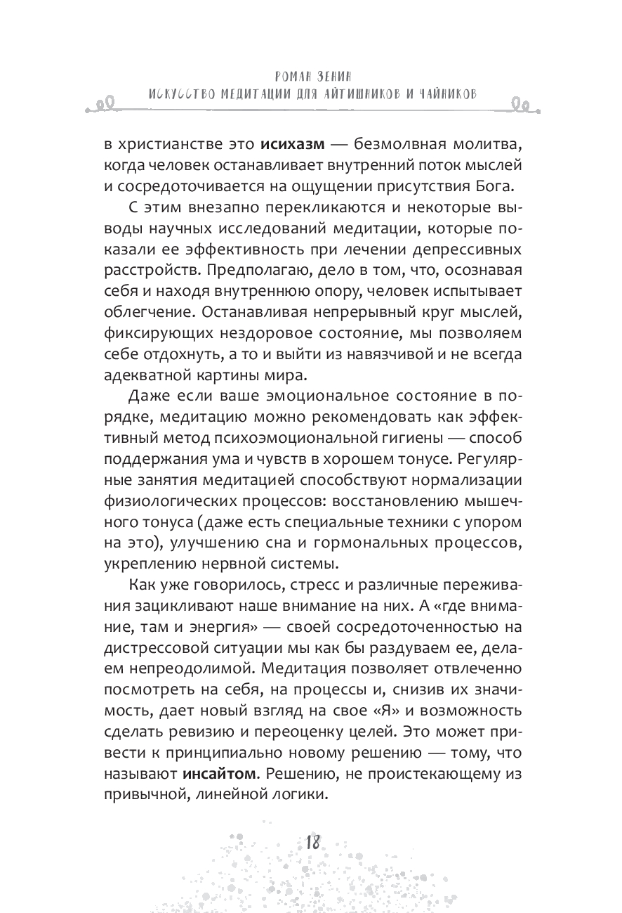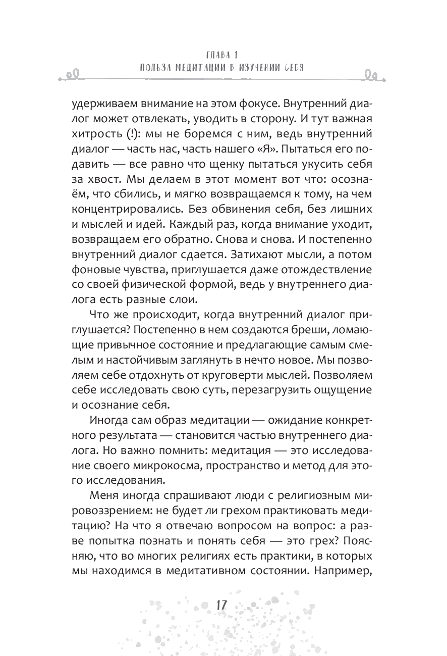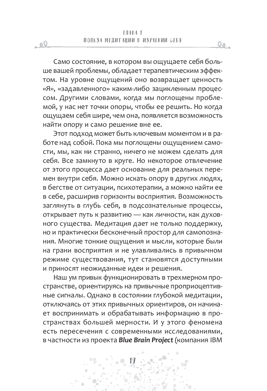 Книга объединяет традиции йоги, современные знания о нейрофизиологии мозга и личный практический опыт автора. Вы узнаете, как справляться со стрессом и зацикленностью на чем-то, сможете остановить бесконечный внутренний диалог, снизить тревожность и эмоциональную перегрузку, улучшить концентрацию и пробудить творческую жилку.