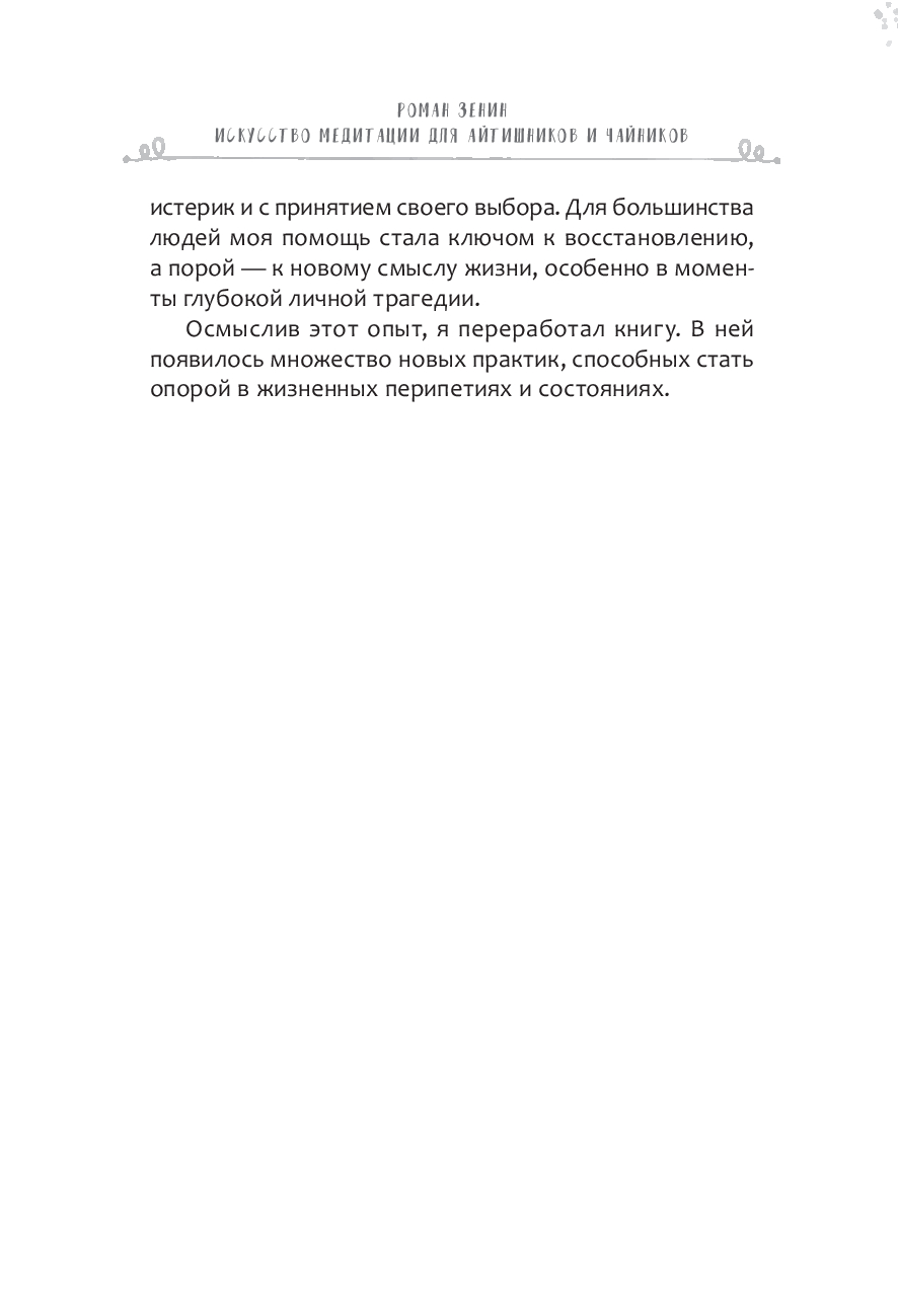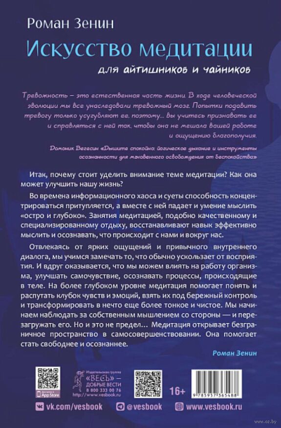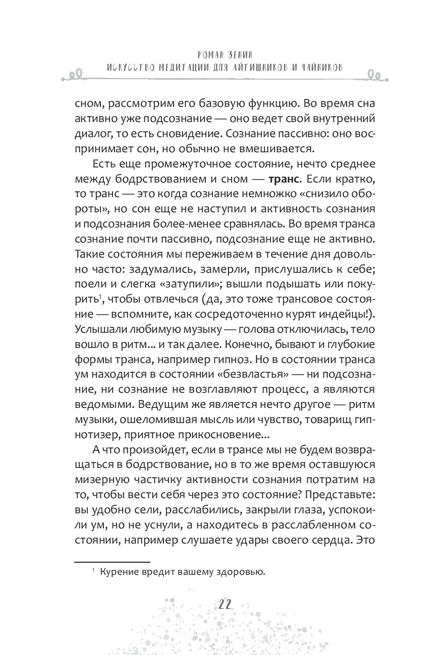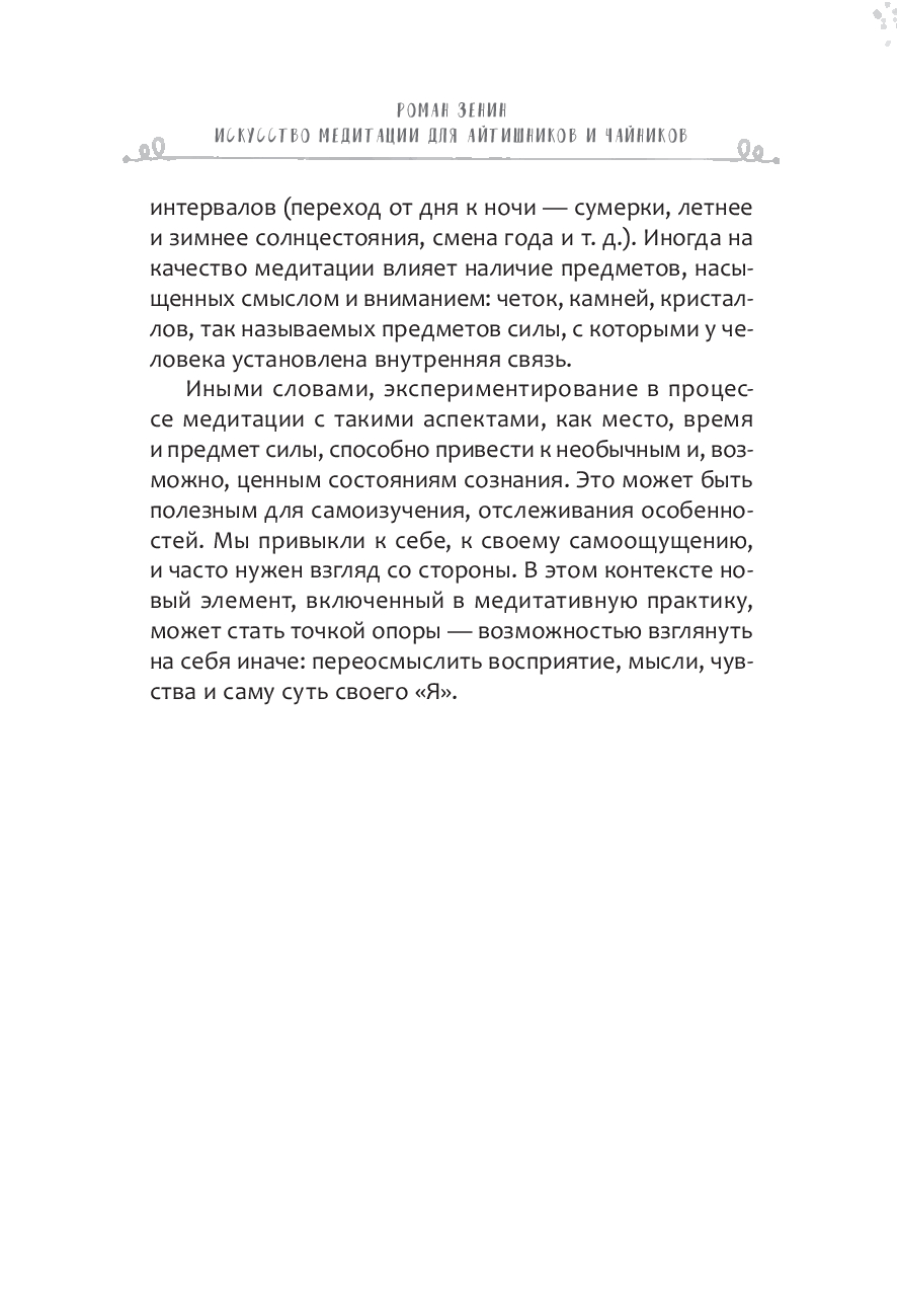 Книга объединяет традиции йоги, современные знания о нейрофизиологии мозга и личный практический опыт автора. Вы узнаете, как справляться со стрессом и зацикленностью на чем-то, сможете остановить бесконечный внутренний диалог, снизить тревожность и эмоциональную перегрузку, улучшить концентрацию и пробудить творческую жилку.