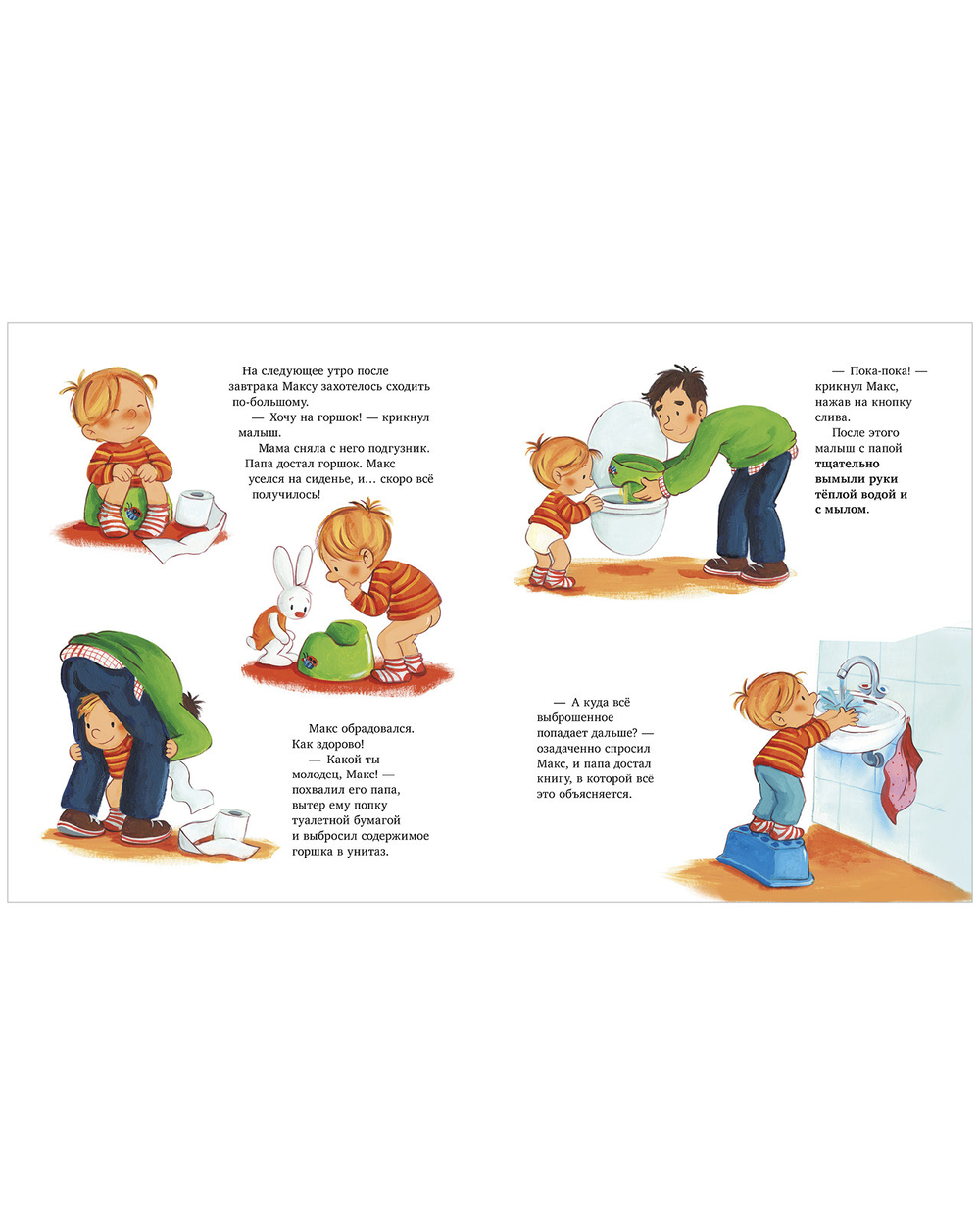 Макс – веселый маленький озорник, который мечтает поскорее изучить окружающий мир. Каждый день он учится всему понемногу: как чистить зубы, самостоятельно одеваться… В этой книжке Макс научится пользоваться горшком и узнает важные правила гигиены.