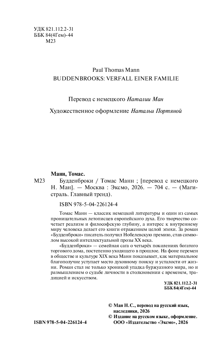 Томас Манн – классик немецкой литературы и один из самых проницательных летописцев европейского духа. Его творчество сочетает реализм и философскую глубину, а интерес к внутреннему миру человека делает его книги отражением целой эпохи. За роман "Будденброки" писатель получил Нобелевскую премию, став символом высокой интеллектуальной прозы XX века.