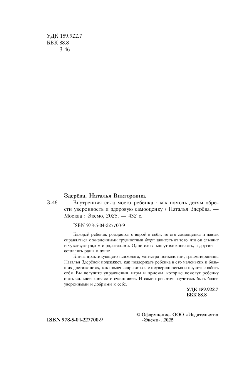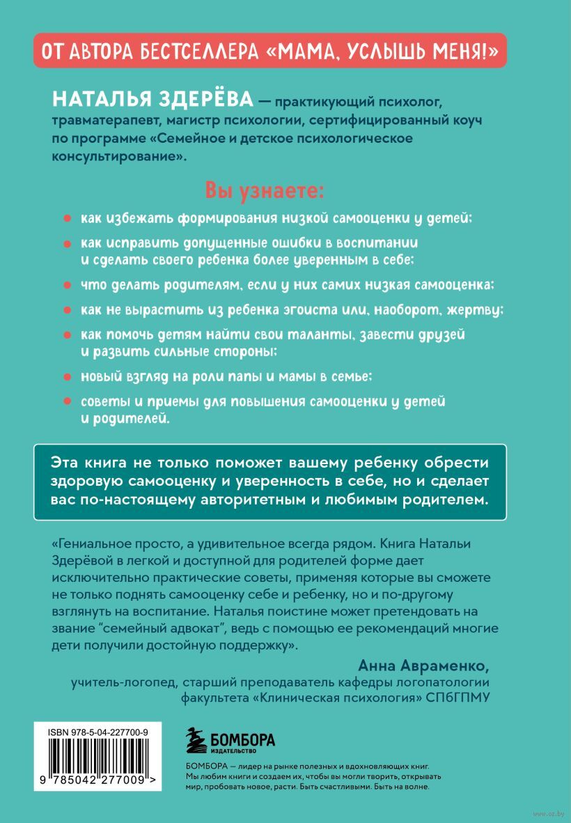 Книга практикующего психолога, травматерапевта и автора популярной книги "Мама, услышь меня!" Натальи Здерёвой подскажет, какие слова и поступки родителей укрепляют в ребенке уверенность и веру в себя, а какие могут оставить незаживающие раны в душе. Вы найдете здесь простые упражнения, игры и приемы, которые помогут вашему ребенку чувствовать себя сильным, смелым и любимым.