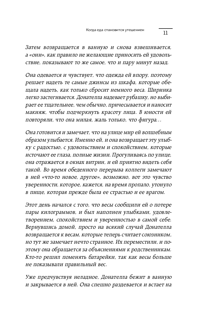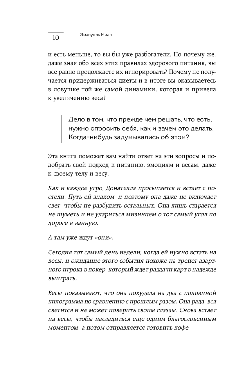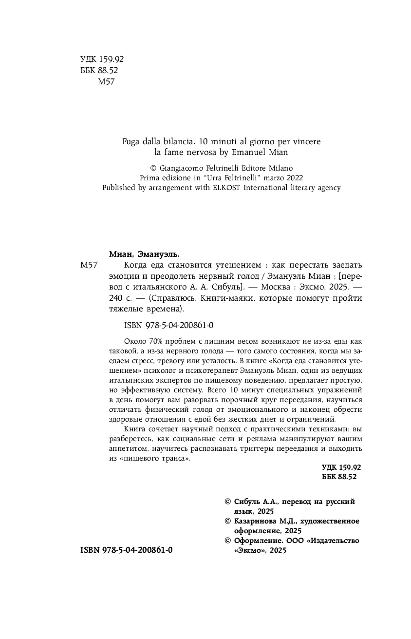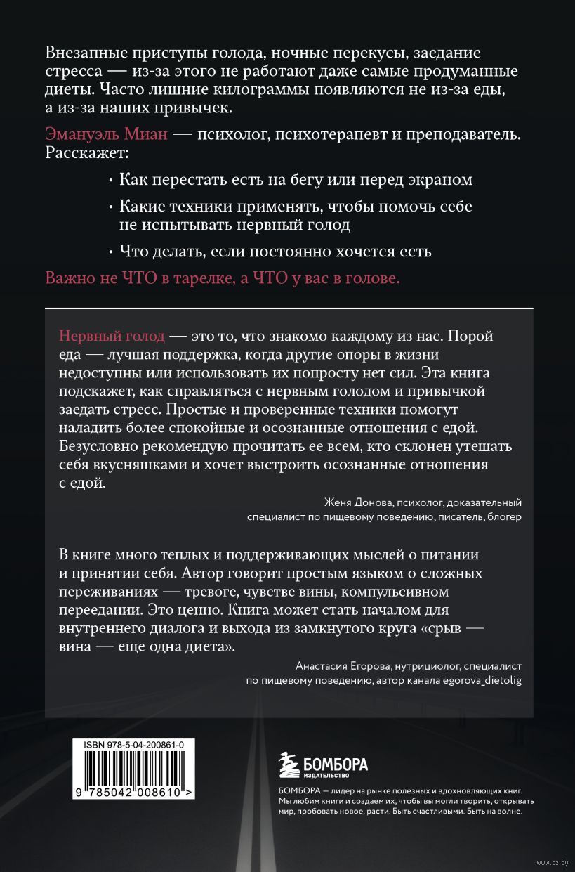 Около 70% проблем с лишним весом возникают не из-за еды как таковой, а из-за нервного голода – того самого состояния, когда мы заедаем стресс, тревогу или усталость. В книге "Когда еда становится утешением" психолог и психотерапевт Эмануэль Миан, один из ведущих итальянских экспертов по пищевому поведению, предлагает простую, но эффективную систему. Всего 10 минут специальных упражнений в день помогут вам разорвать порочный круг переедания, научиться отличать физический голод от эмоционального и наконец обрести здоровые отношения с едой без жестких диет и ограничений.