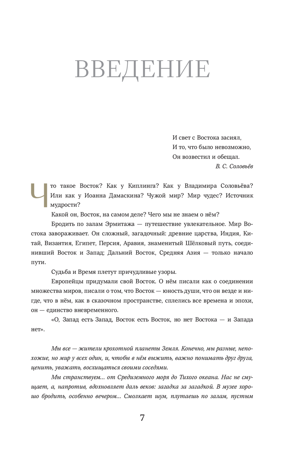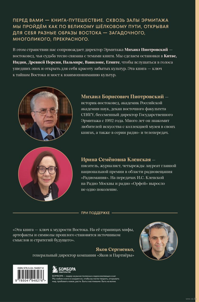 Директор Эрмитажа Михаил Пиотровский и известная ведущая радиопередач о культуре Ирина Кленская приглашают вас в путешествие по древним царствам Востока. Бродя по залам Эрмитажа, разглядывая китайский фарфор, иранские ковры, индийские статуэтки, вы почувствуете, как начинает оживать прошлое. Вы узнаете легенды, связанные с могущественными царицами Клеопатрой и Семирамидой, побываете в древних Пальмире, Вавилоне, Египте, Китае, Персии – почувствуете тот Восток, который манил и вдохновлял европейских путешественников.