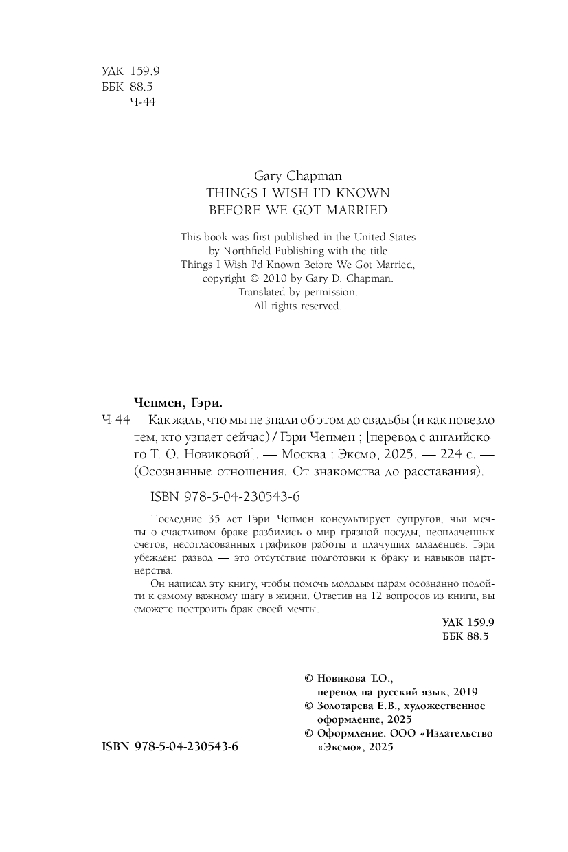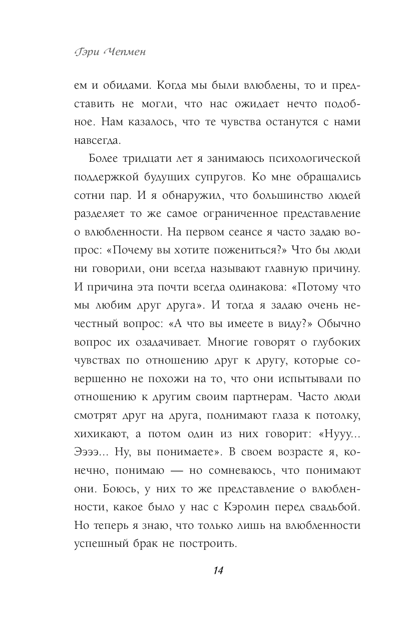 Последние 35 лет Гэри Чепмен консультирует супругов, чьи мечты о счастливом браке разбились о мир грязной посуды, неоплаченных счетов, несогласованных графиков работы и плачущих младенцев. Гэри убежден, развод – это отсутствие подготовки к браку и навыков партнерства.