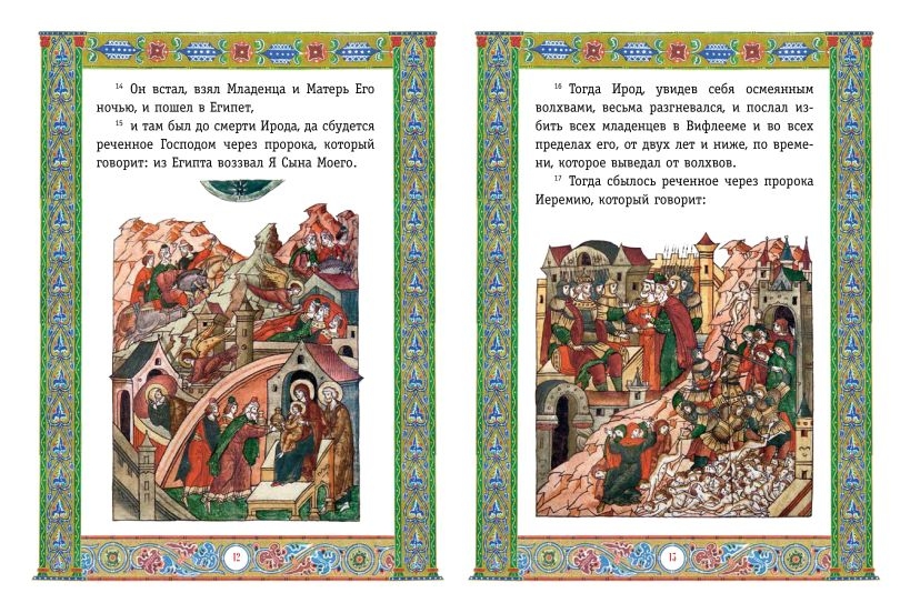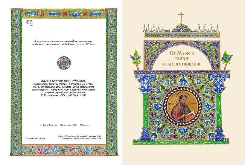 Уникальное издание Святого Евангелия в подарочном оформлении! Обложка покрыта бархатной тканью с золотым тиснением. Обрез серебряный, внутри цветные гравюры из Лицевого летописного свода Иоанна Грозного на плотной мелованной бумаге!