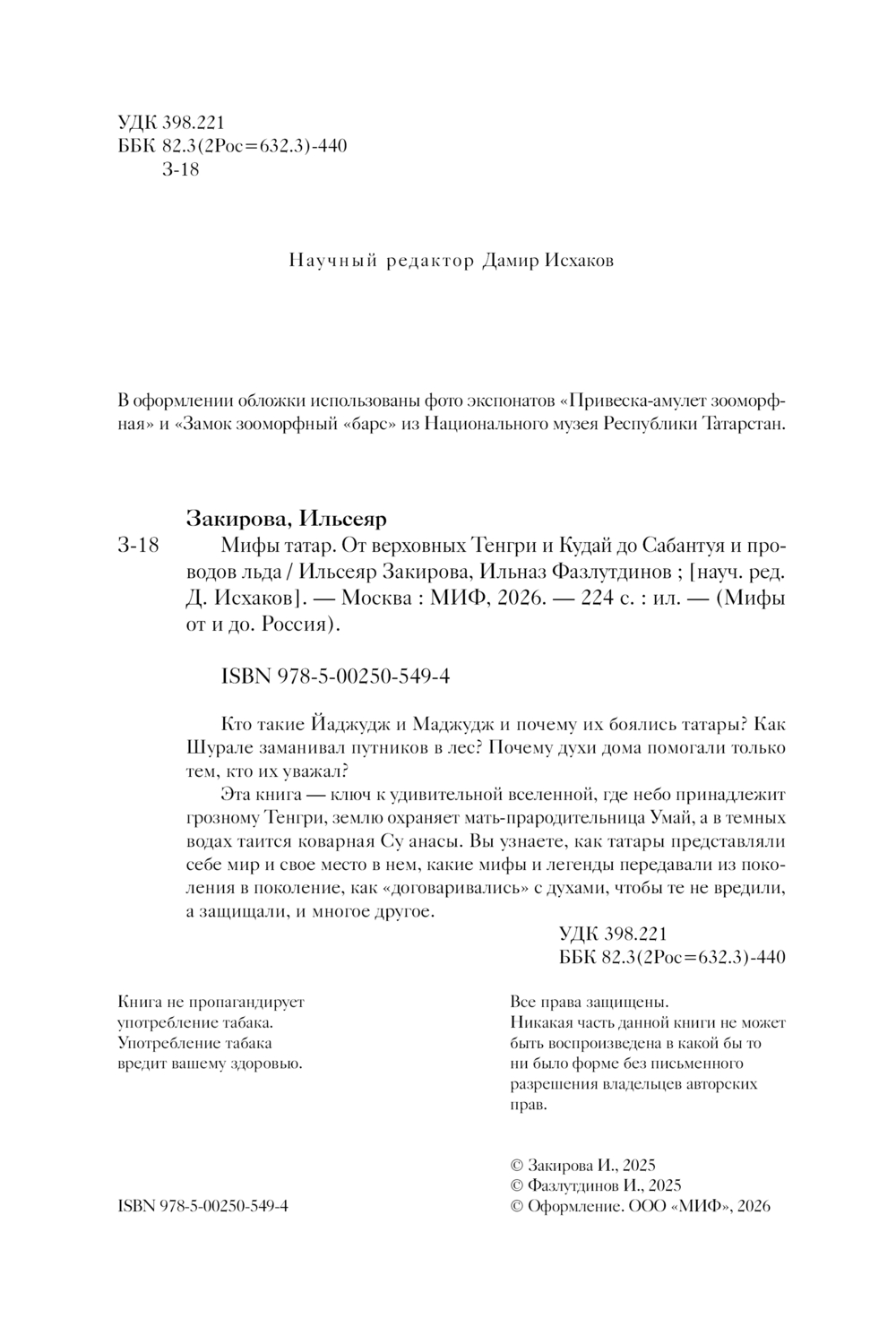 Эта книга – ключ к удивительной вселенной, где небо принадлежит грозному Тенгри, землю охраняет мать-прародительница Умай, а в темных водах таится коварная Су анасы. Вы узнаете, как татары представляли себе мир и свое место в нем, какие мифы и легенды передавали из поколения в поколение, как "договаривались" с духами, чтобы те не вредили, а защищали, и многое другое.