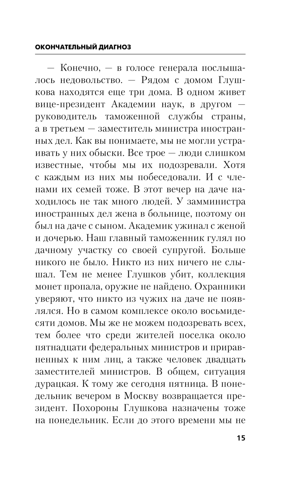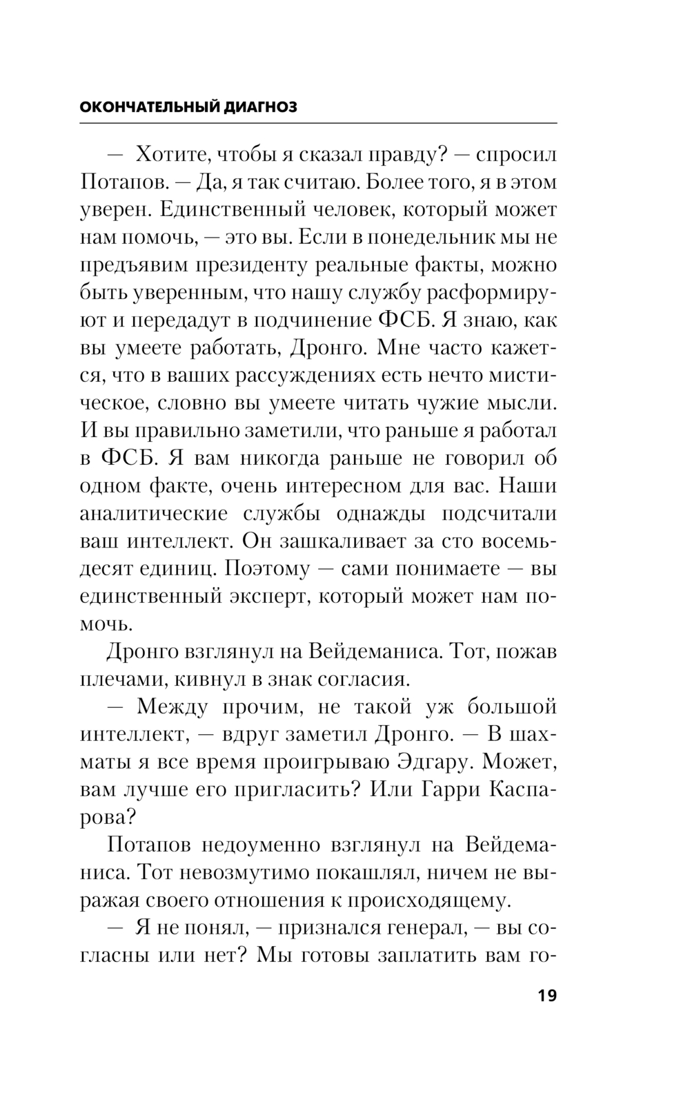 Смерть таких выдающихся людей, как академик Глушков, – всегда явление заметное. А если уж она была насильственной, то сразу попадает в центр внимания ФСБ. Однако даже лучшие сотрудники службы не в силах выявить мотивы преступления. Они не могут понять, кому мог помешать безобидный ученый, кристально честный человек, не имевший врагов. Следствие заходит в окончательный тупик, когда вслед за Глушковым загадочным образом гибнет его сосед по даче. Вопросы, вопросы… В конце концов руководство ФСБ признает, что ответить на них может лишь один человек – знаменитый эксперт Дронго…