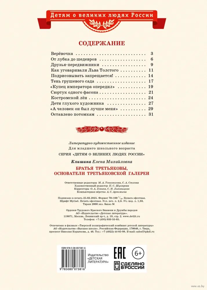 Книга повествует о жизни и деятельности двух знаменитых отечественных меценатов – купцов Павла и Сергея Третьяковых. Именно с их собрания картин началась коллекция нынешней всемирно известной Третьяковской галереи. Павел Михайлович передал её городу. Благодаря им мы можем сейчас любоваться знаменитыми полотнами русских живописцев. Для младшего школьного возраста