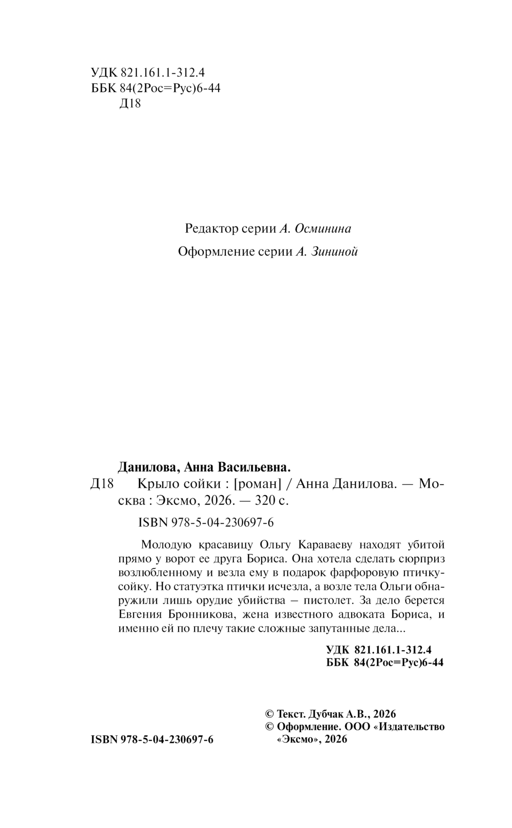 Молодую красавицу Ольгу Караваеву находят убитой прямо у ворот своего друга Бориса. Она хотела сделать сюрприз возлюбленному и везла ему в подарок фарфоровую птичку-сойку. Но статуэтка птички исчезла, а возле тела Ольги обнаружили лишь орудие убийства – пистолет. За дело берется Евгения Бронникова, жена известного адвоката Бориса, и именно ей по плечу такие сложные запутанные дела…