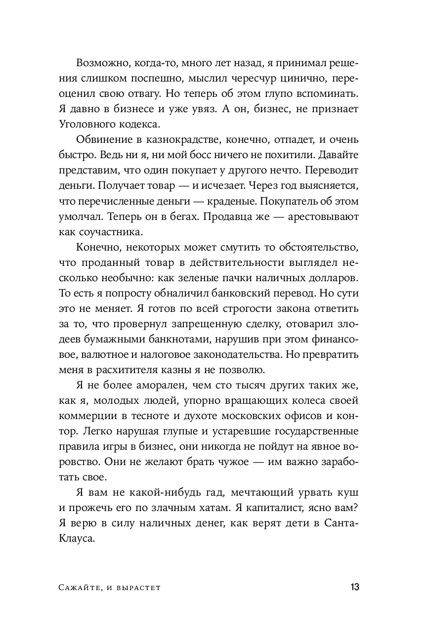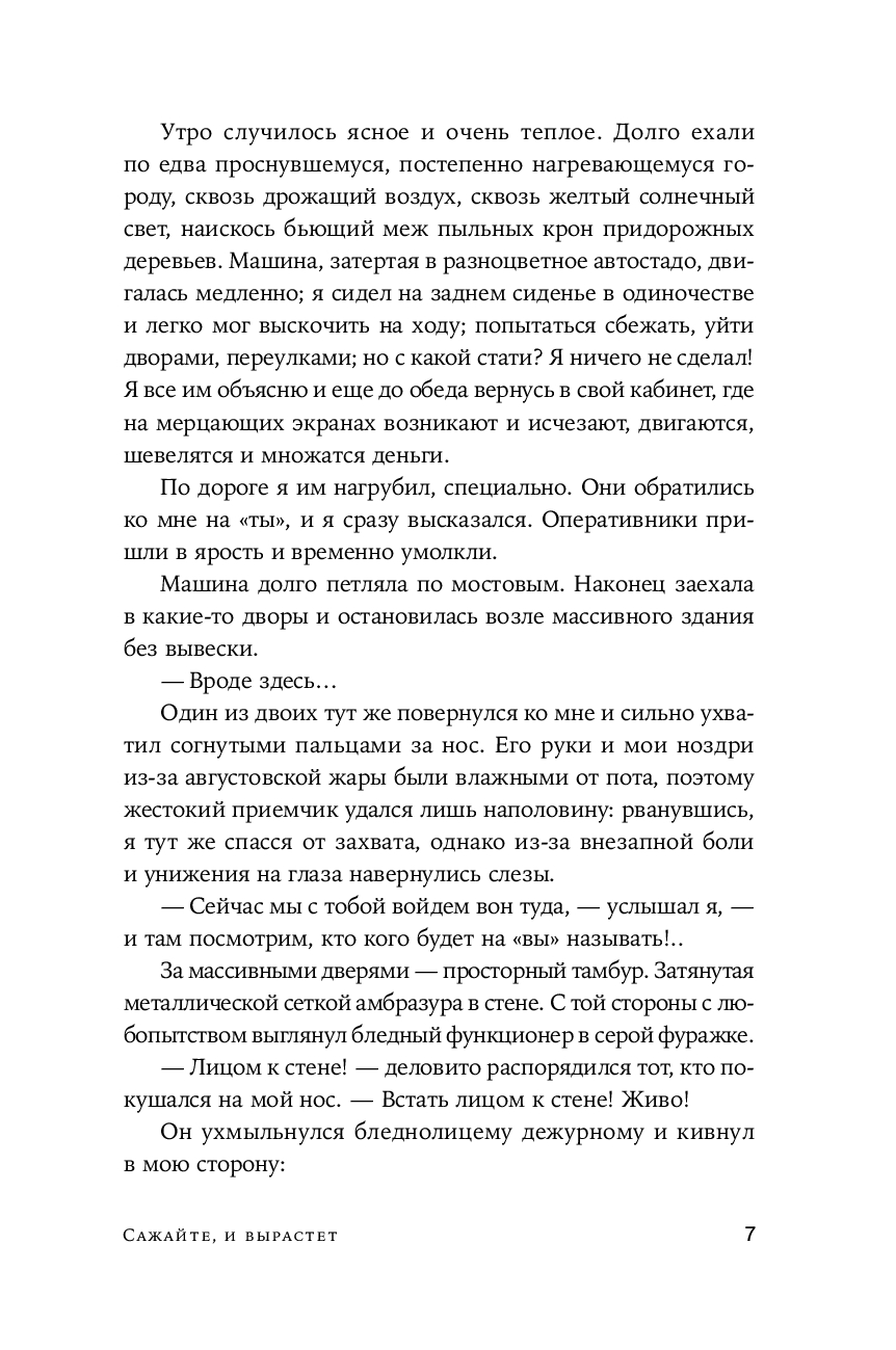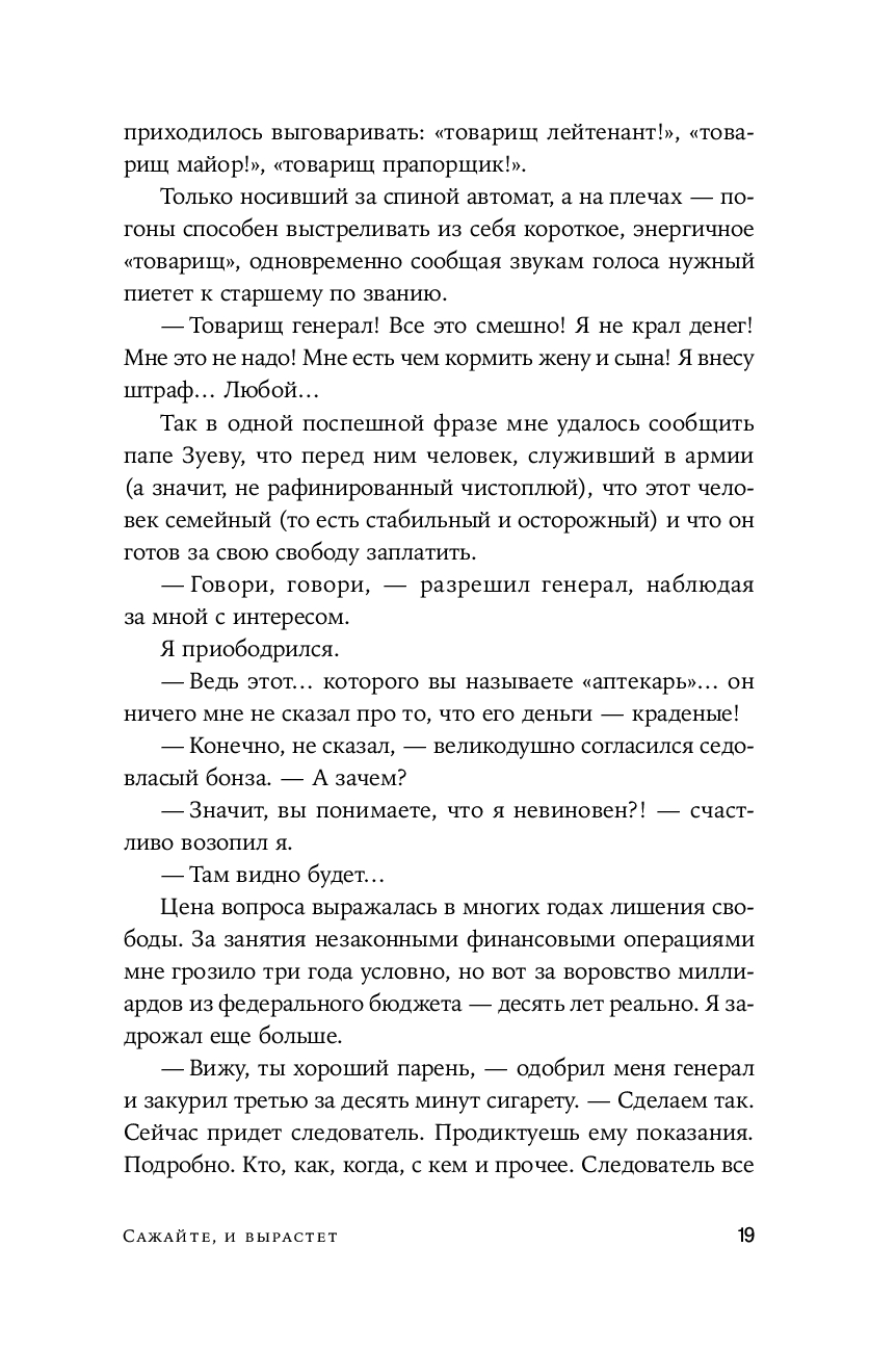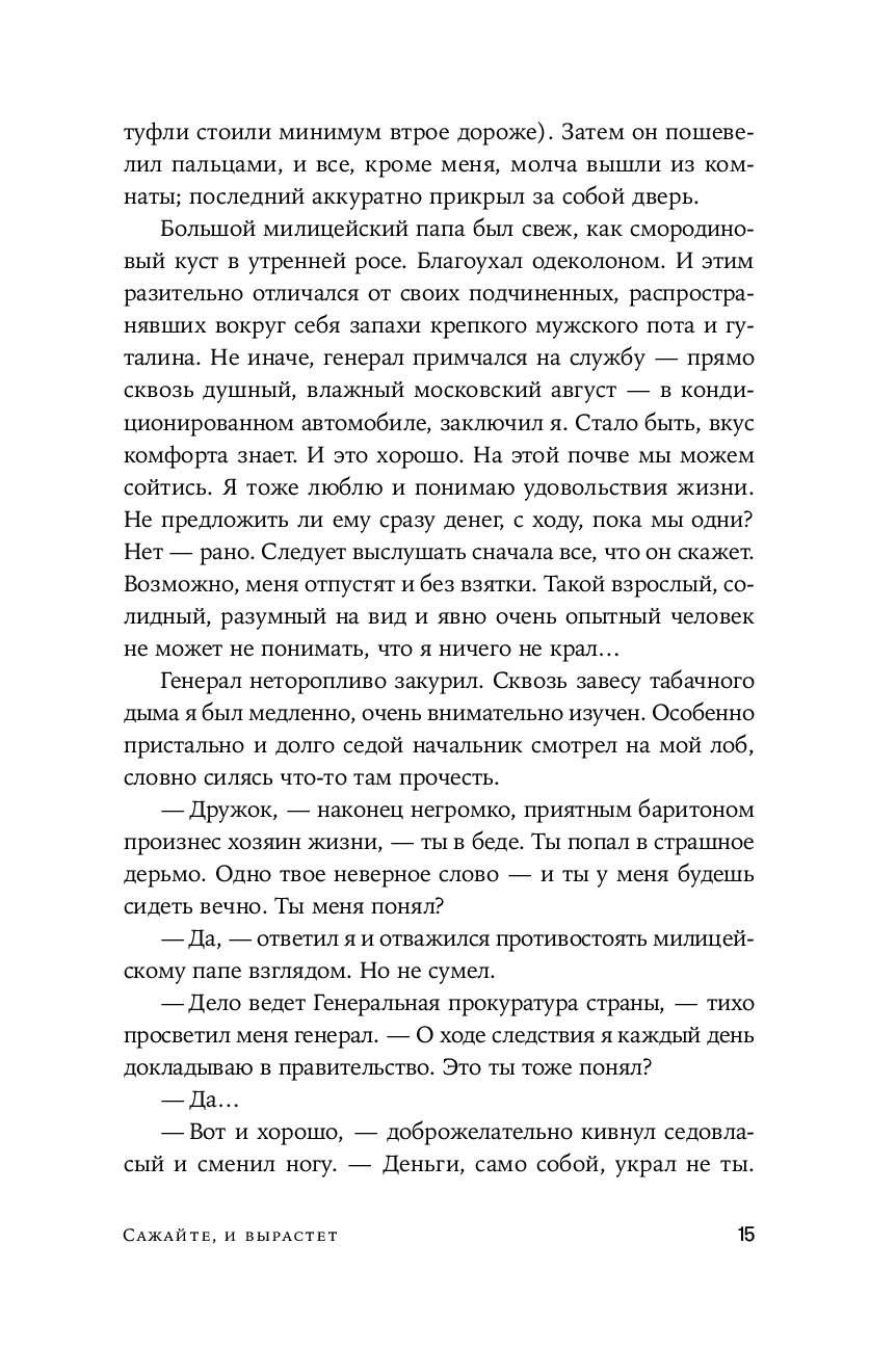 Один герой. Одна страна. Несколько тюрем – внутри и снаружи. Путь от банковских сделок и светских искушений до одиночной камеры и мастер-классов по выживанию. "Сажайте, и вырастет" – роман о странных и по-своему славных годах, когда обновленная Москва, вылупившись из разрушенной Совдепии, расправила еще сырые крылья над стремительно меняющейся Россией. Это история о новых перспективах, обернувшихся западней, о надеждах и чаяниях и о том, где заканчиваются иллюзии и начинается настоящая жизнь. Это жесткая и очень человечная быль-небыль для тех, кто верит, что за пределами настоящей или мнимой неволи можно обрести если не свободу, то хотя бы искренность.
