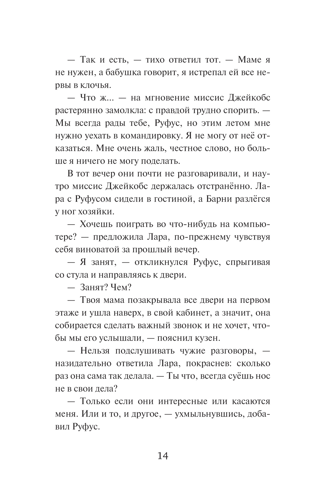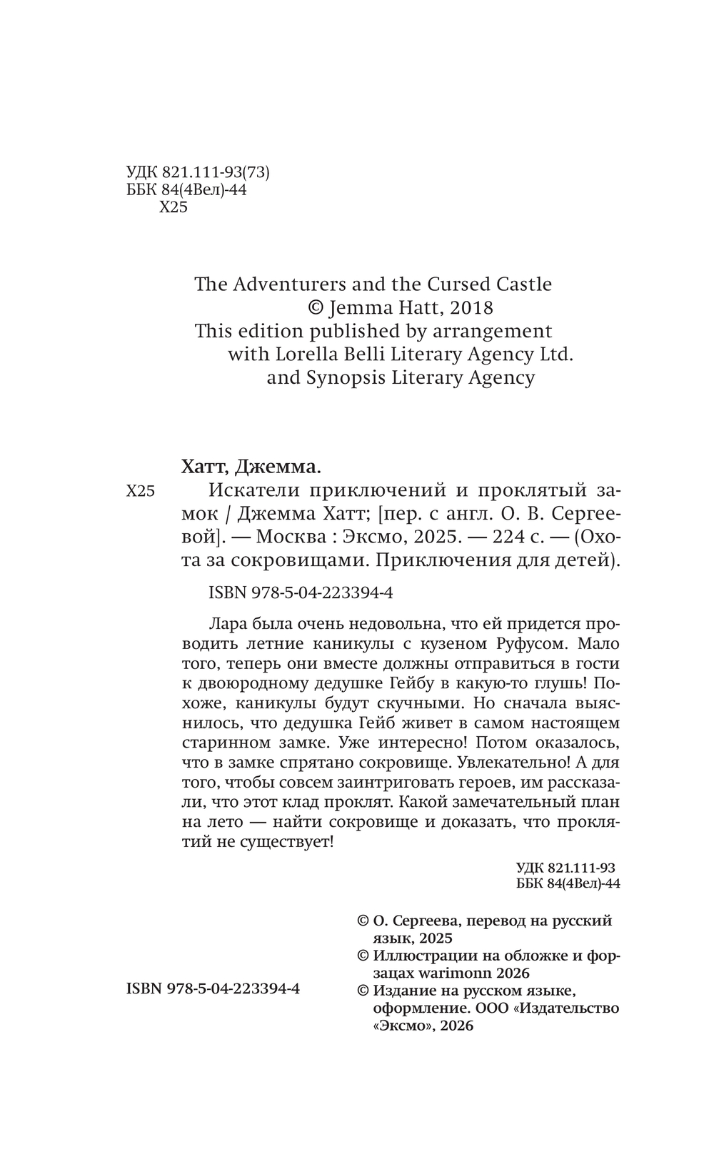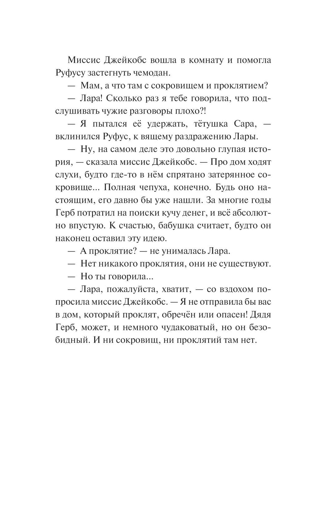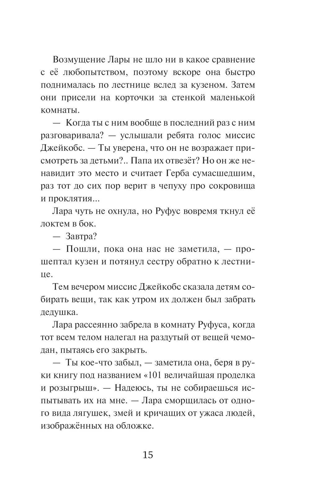 Лара была очень недовольна, что ей придется проводить летние каникулы с кузеном Руфусом. Мало того, теперь они вместе должны отправиться в гости к двоюродному дедушке Гейбу в какую-то глушь! Похоже, каникулы будут скучными. Но сначала выяснилось, что дедушка Гейб живет в самом настоящем старинном замке. Уже интересно! Потом оказалось, что в замке спрятано сокровище. Увлекательно! А для того, чтобы совсем заинтриговать героев, им рассказали, что этот клад проклят. Какой замечательный план на лето – найти сокровище и доказать, что проклятий не существует!