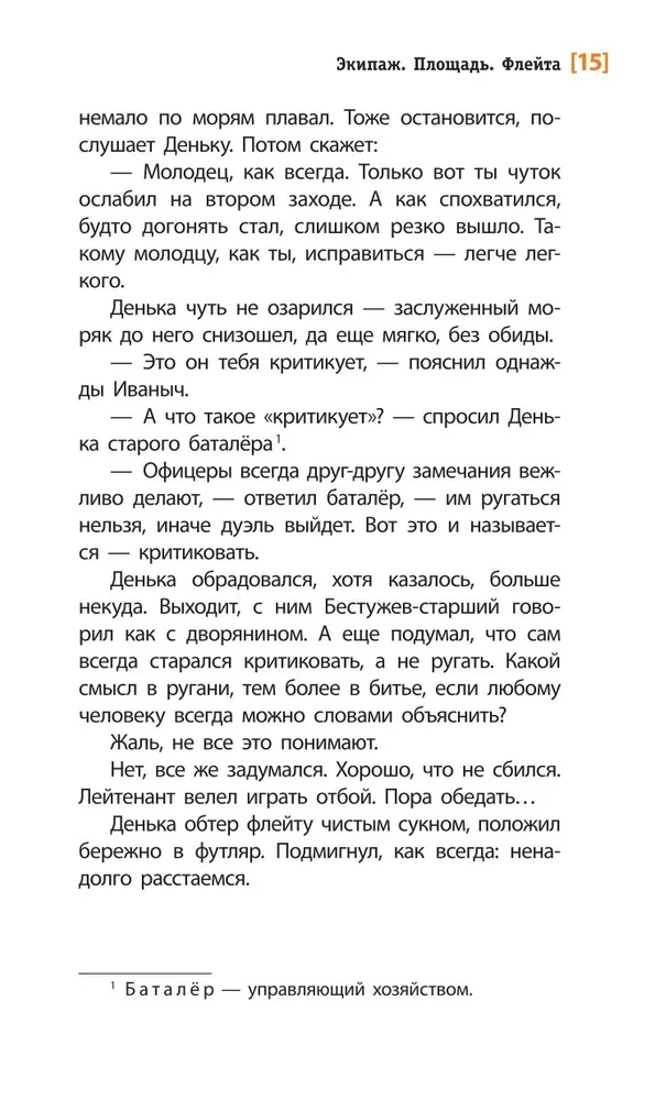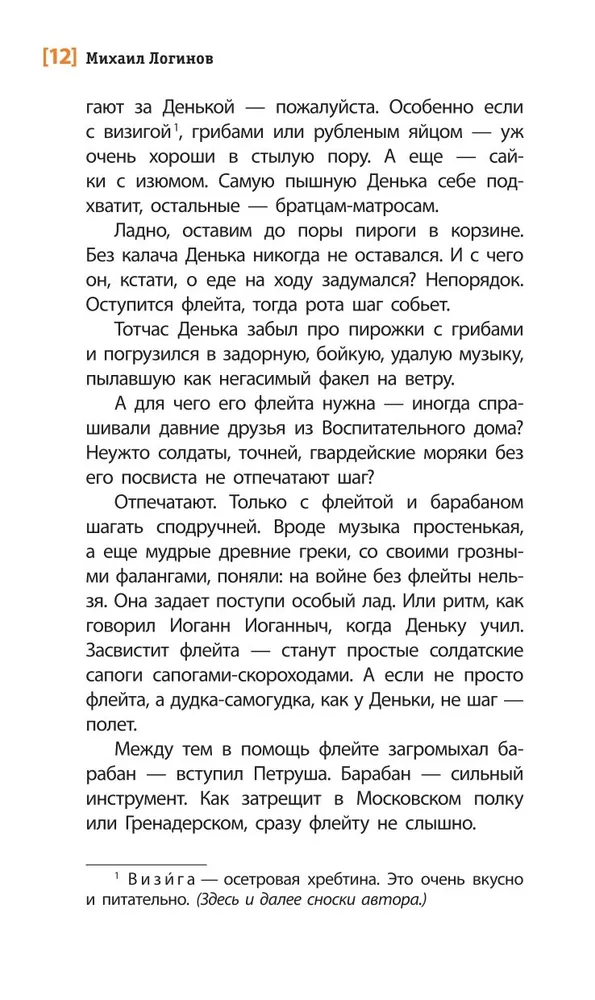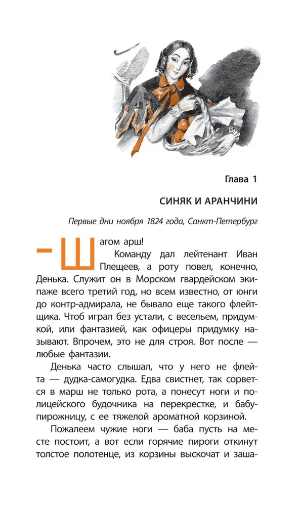 Историческая повесть, рассказывающая о юном флейтисте Денисе, служащем в Морском гвардейском экипаже. Повесть наполнена звуками: мелодиями флейты и фортепиано, ударами барабана, пением птиц, голосами улицы, шумом балтийских волн и свистом ветра.