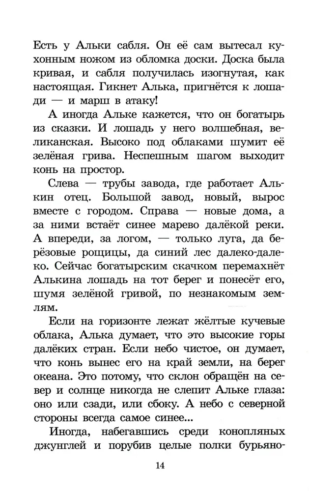 Цикл маленьких рассказов, объединенных одним главным героем семилетним Алькой, рассказывающих о детских приключениях, мечтах и маленьких подвигах. Книга из обязательной части программы по литературе. В повести пример детской дружбы, когда ребятам хорошо, потому что они вместе и без всяких электронных развлекалок могут придумать много интересного с многочисленными примерами взаимовыручки и психологической поддержки. В книге идёт речь о верности принципам рыцарской чести и нравственности. Герои повести искренни, открыты, делятся тем, что умеют сами и потому нужны друг другу независимо от возраста и способностей. Для среднего школьного возраста.