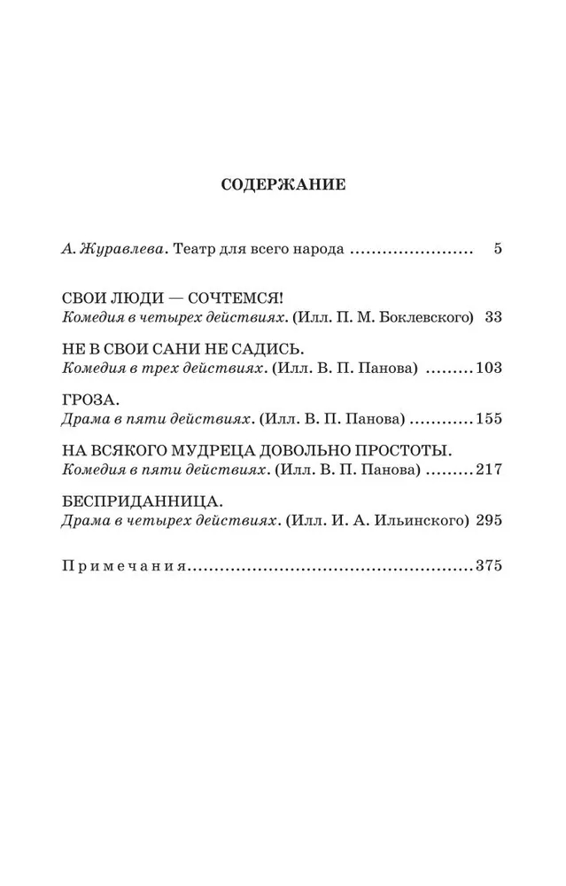 Сборник пьес великого драматурга, создателя русского национального театра А. Н. Островского. В книгу вошли: "Свои люди – сочтемся!", "Не в свои сани не садись", "Гроза", "На всякого мудреца довольно простоты" и "Бесприданница".