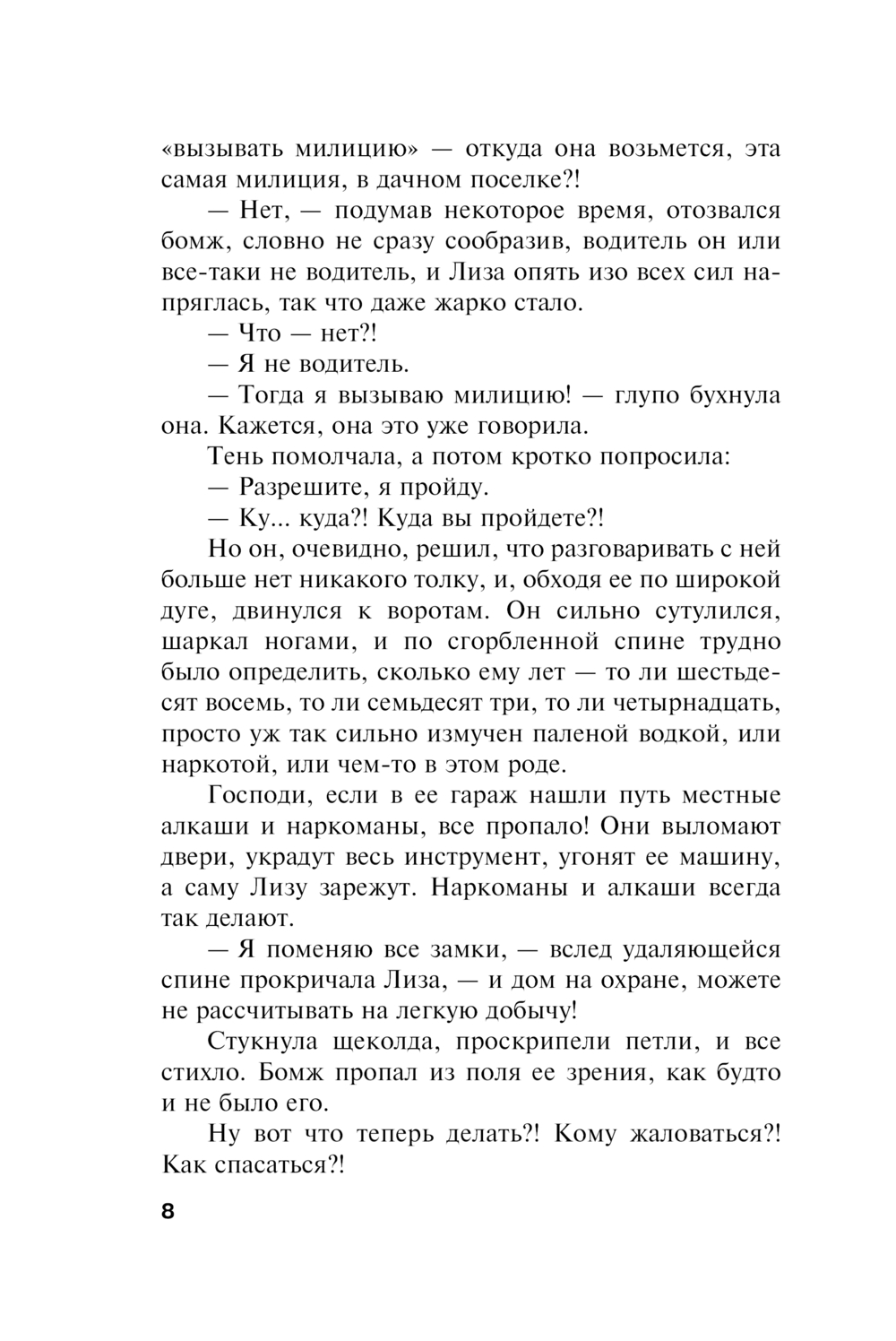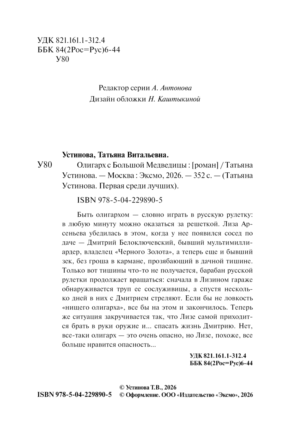 Быть олигархом, словно играть в русскую рулетку: в любую минуту можно оказаться за решеткой. Лиза Арсеньева убедилась в этом, когда у нее появился сосед по даче – Дмитрий Белоключевский, бывший мультимиллиардер, владелец "Черного Золота", а теперь еще и бывший зек, без гроша в кармане, прозябающий в дачной тишине. Только вот тишины что-то не получается, барабан русской рулетки продолжает вращаться: сначала в Лизином гараже обнаруживается труп ее сослуживицы, а спустя несколько дней в них с Дмитрием стреляют. Если бы не ловкость "нищего олигарха", все бы на этом и закончилось. Теперь же ситуация закручивается так, что Лизе самой приходится брать в руки оружие и… спасать жизнь Дмитрию. Нет, все-таки олигарх – это очень опасно, но Лизе, похоже, все больше нравится опасность...