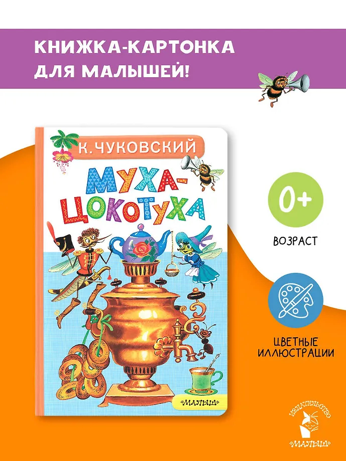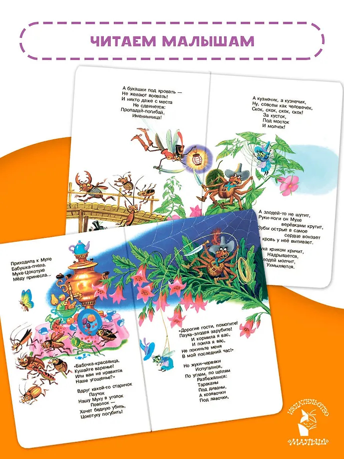 Красавица Муха купила красивый самовар и позвала всех своих друзей-насекомых на чаепитие. Но кроме доброй бабушки-пчелы, весёлых тараканов и маленьких букашек в гости пришёл… злодей Паук! Чтобы узнать, чем закончилась эта история, читайте известную сказку Корнея Чуковского!