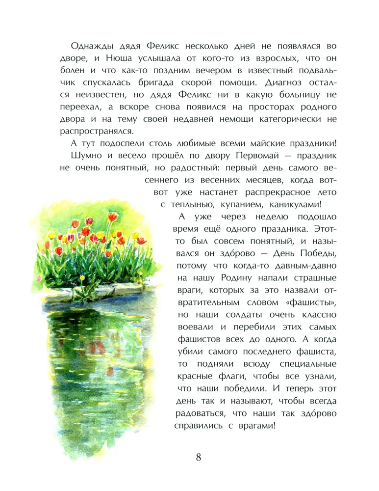 Эта книга учит уважению к прошлому. В майский праздник Дня Победы девочка Нюша и все ребята с их двора неожиданно узнали, что хорошо знакомый им старенький, всегда опирающийся на костыль дядя Феликс был когда-то солдатом, воевал с фашистами, получил множество наград. И потому он и такие же, как он, ветераны, – это последние солдаты Великой Отечественной войны, то есть Самые Главные Герои на свете. Кроме рисунков к тексту рассказа, в книгу включены исторически достоверные картины сражений, запечатлевшие действия разных родов войск и военной техники времен войны. Первый бой пограничников с фашистами; артиллеристы, ведущие огонь под Смоленском; зенитчики, защищающие московское небо; атака пехоты; морской десант; подводная лодка, атаковавшая противника торпедами; истребитель, сбивший вражеский самолет; легендарный танк Т-34 и, наконец, последний бой в берлинском рейхстаге – таков изобразительный ряд, который поможет читателю ощутить дух времени, лучше понять реальные события и факты.