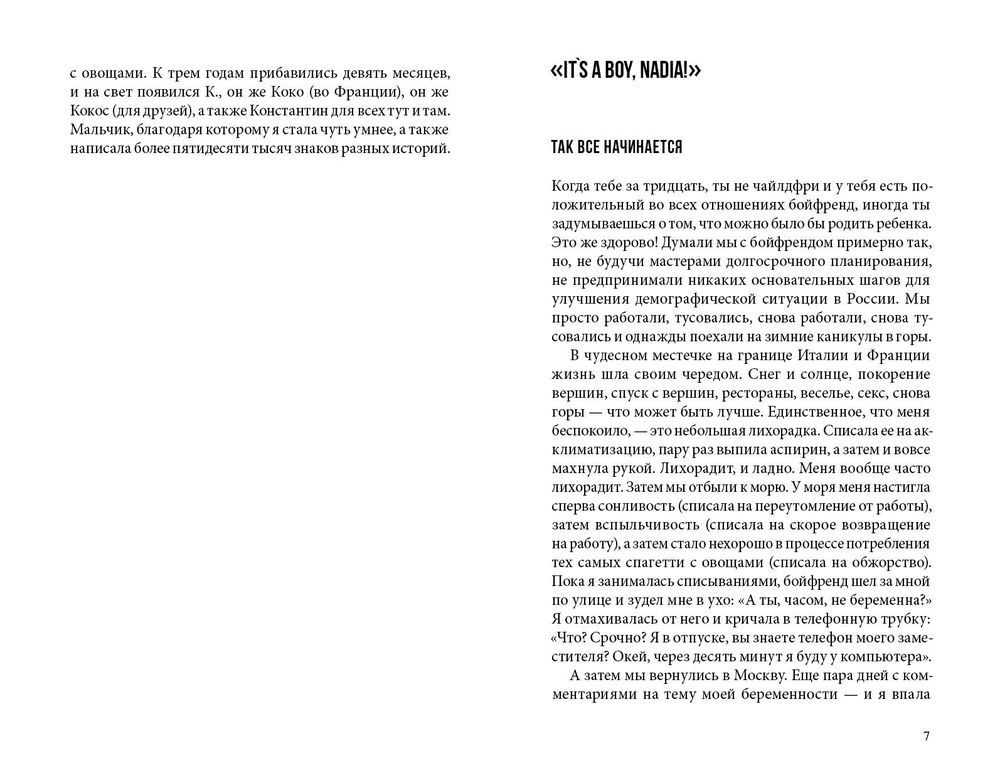 Конечно, это не "ещё один справочник": информации о том, как правильно растить и воспитывать ребёнка, а равно и противоречивых рекомендаций вокруг великое множество. Надя искренне и непосредственно описывает свой опыт беременности, родов, общения с ребёнком в первый год жизни. Она не пытается что-либо советовать или указывать, а в репортажной манере фиксирует и трезво анализирует происходящее с ней, приправляя факты щедрой порцией иронии.