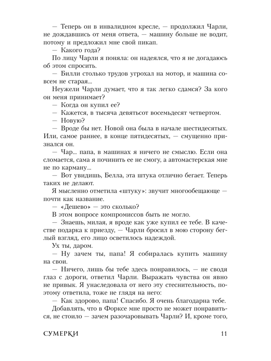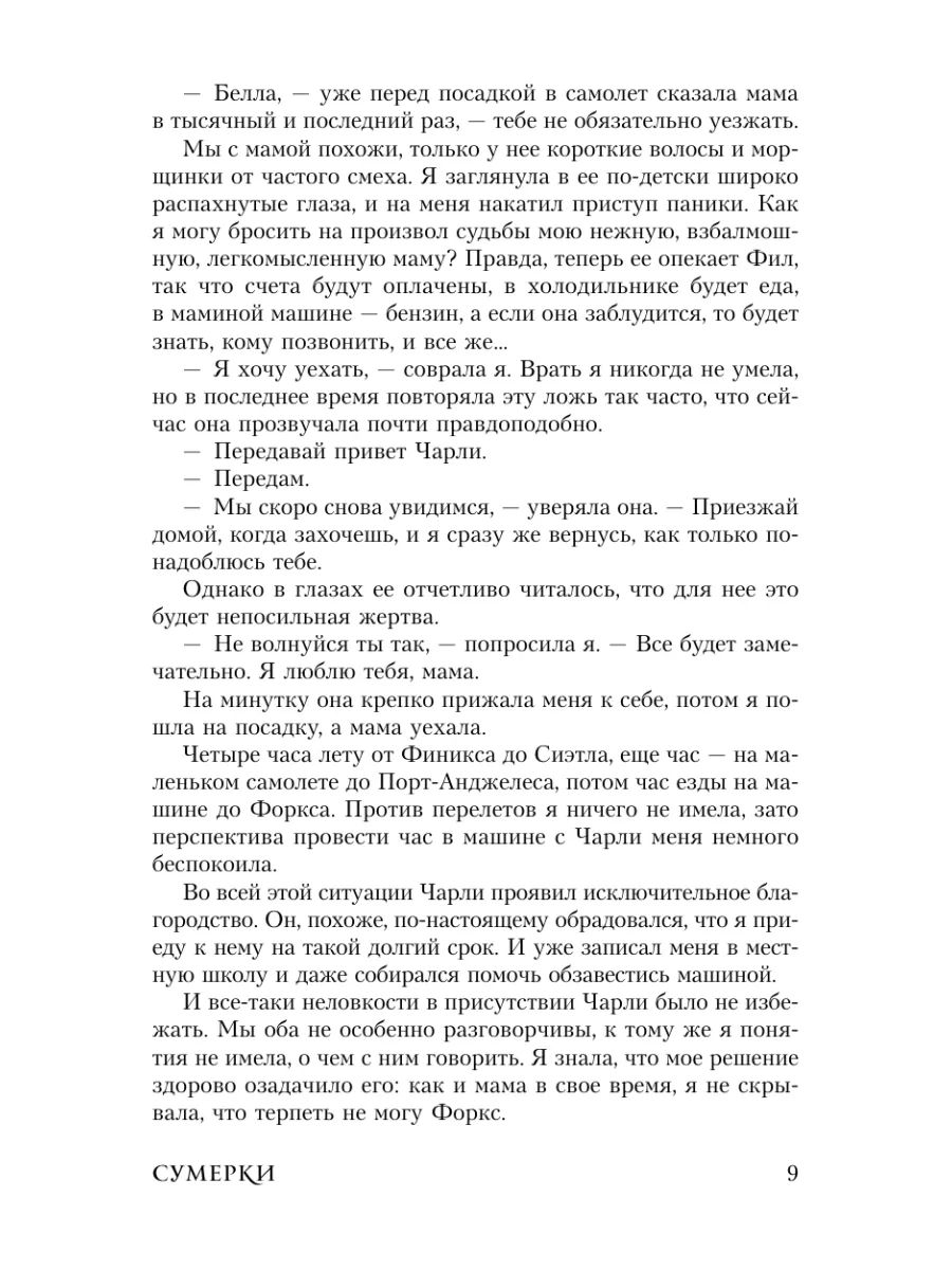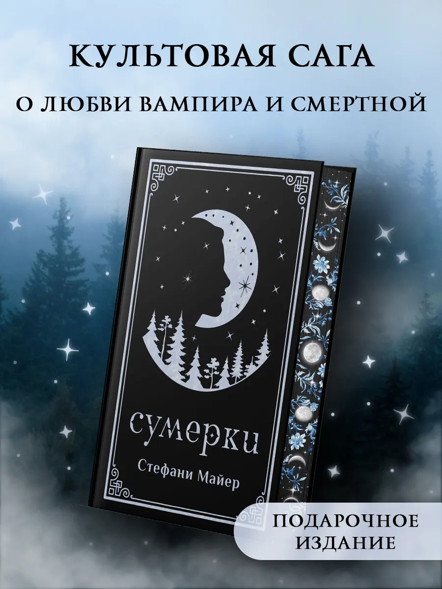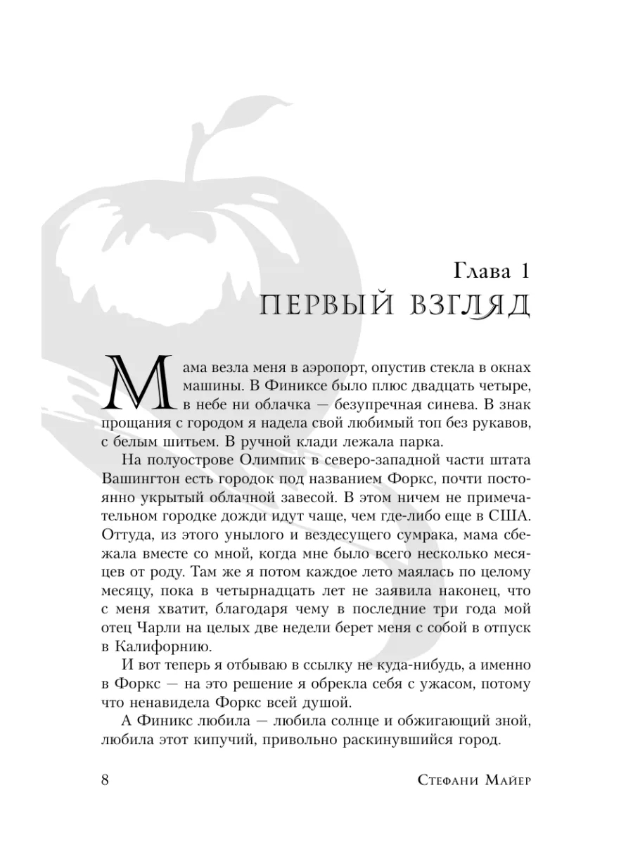 Казалось бы, переезд Изабеллы Свон в Форкс – небольшой городок в штате Вашингтон – не сулил никаких перемен в ее жизни… Пока она не встретила таинственного и обаятельного Эдварда Каллена. До сих пор Эдварду удавалось скрывать, что он выходец из аристократического вампирского клана, но теперь все меняется. Белла становится самым дорогим для него человеком, и она же оказывается в смертельной опасности. Неужели единственный способ защитить ее – отказаться от их любви?