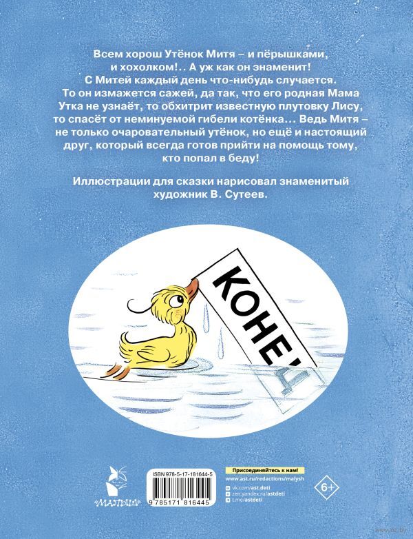 В книгу вошла сказка М. Михайлова про храброго, озорного и любознательного Утёнка Митю. С пернатым непоседой каждый день происходят разные истории, но Митя всегда выходит сухим из воды. Недаром он Утёнок! А ещё у Мити много друзей, ведь он всегда готов прийти на помощь тому, кто попал в беду.