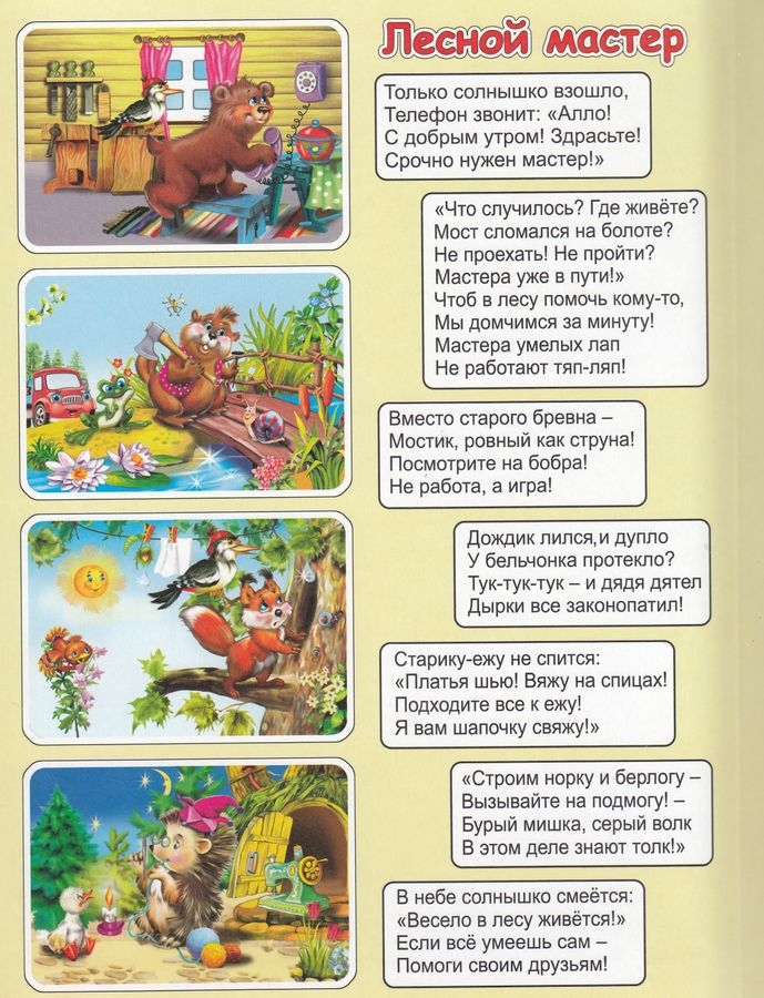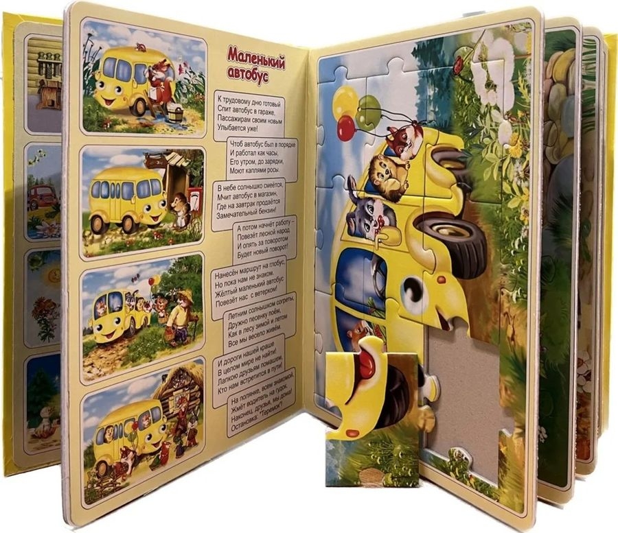 Книжка большого формата из пенополистирола в твердой глянцевой обложке. На каждом развороте пазл из 9 крупных элементов. Потешки, считалки, сказки – все это увлечет малыша, а во время чтения он соберет интересную картинку по смыслу текста.