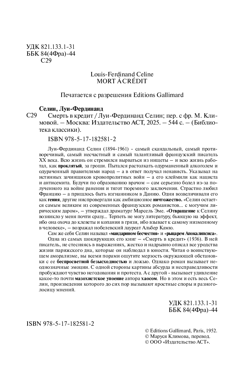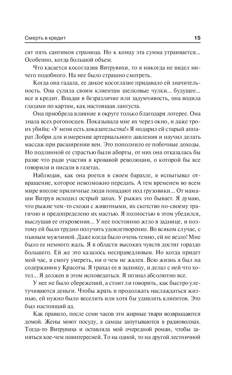 Одна из самых шокирующих его книг – "Смерть в кредит" (1936). В ней писатель,не стесняясь в выражениях, жестко и надрывно описал все уродства жизни парижского дна, которые он наблюдал в юности.