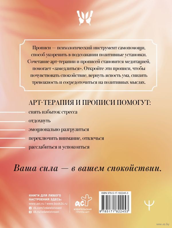 Арт-терапия поможет вам привести в порядок мысли после тяжелого дня, восстановить эмоциональный баланс и обрести внутреннее спокойствие. Прописи формируют новые нейронные связи: подсознание впитывает позитивные установки и постепенно начинает менять отношение к жизни. Всего 5–10 минут работы с тетрадью помогают успокоиться и сосредоточиться на позитивных мыслях.
