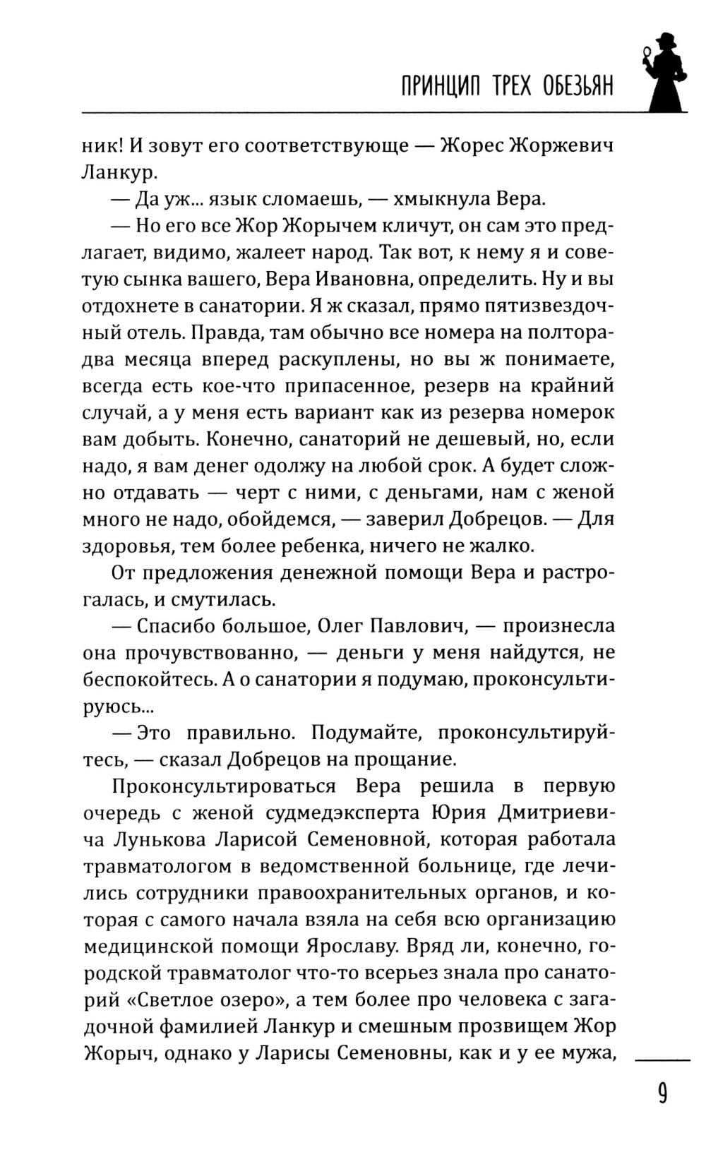 Тайна – появление там нового замруководителя межрайонного следственного отдела Вадима Павлинова, которого вместо Москвы отправили на периферию. Тайна – участие в расследовании старшего следователя регионального управления СК Веры Грозновой, приехавшей туда подлечить сына... В кабинете директора санатория Ирины Голубович висит панно с обезьянами: одна закрывает глаза, другая – уши, третья – рот. Ничего не вижу, ничего не слышу, ничего никому не скажу. Но когда все тайны удастся развеять, будут раскрыты и мотивы преступлений, и сами преступники.