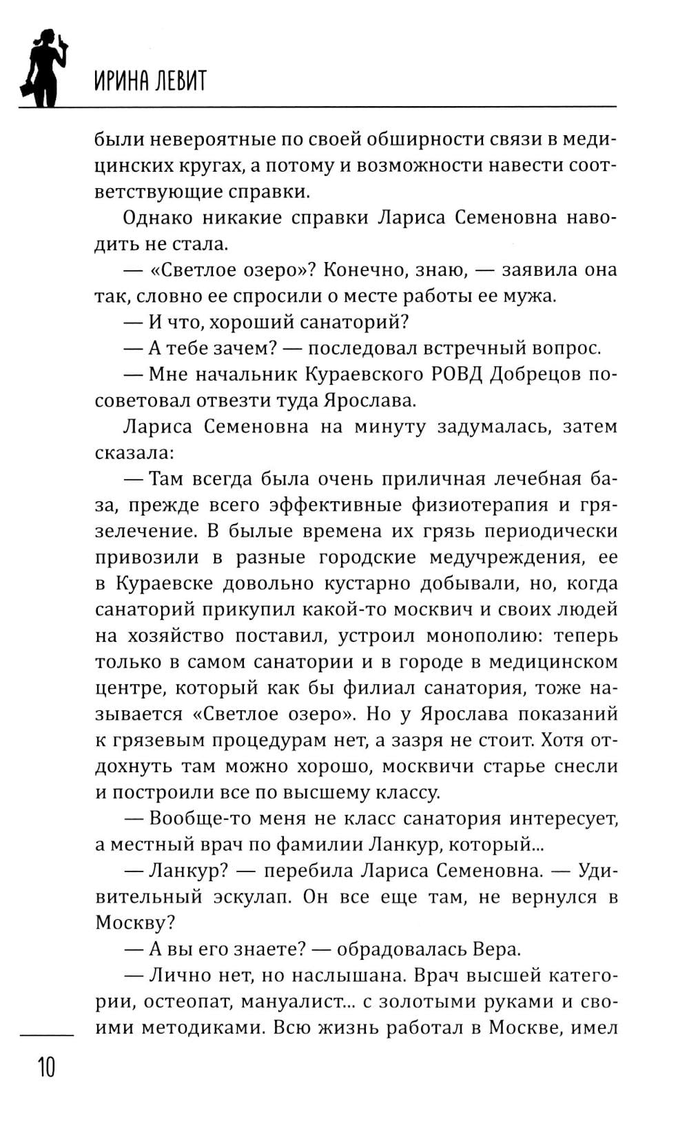 Тайны могут быть завораживающими, могут быть и очень опасными – за них порой убивают. Вот и в романе Ирины Левит их достаточно. Тайна – зачем Агата Чернецкая, предпочитающая активный отдых, вдруг поехала среди зимы в санаторий "Светлое озеро", расположенный в небольшом райцентре Кураевск. Тайна – с какой целью девушка, равнодушная к стихам, отправилась на вечер поэзии, организованный в районной библиотеке. Тайна – почему Агату убили именно в библиотеке, причем забрав ее обувь. Тайна – что происходит в спокойном и респектабельном санатории.