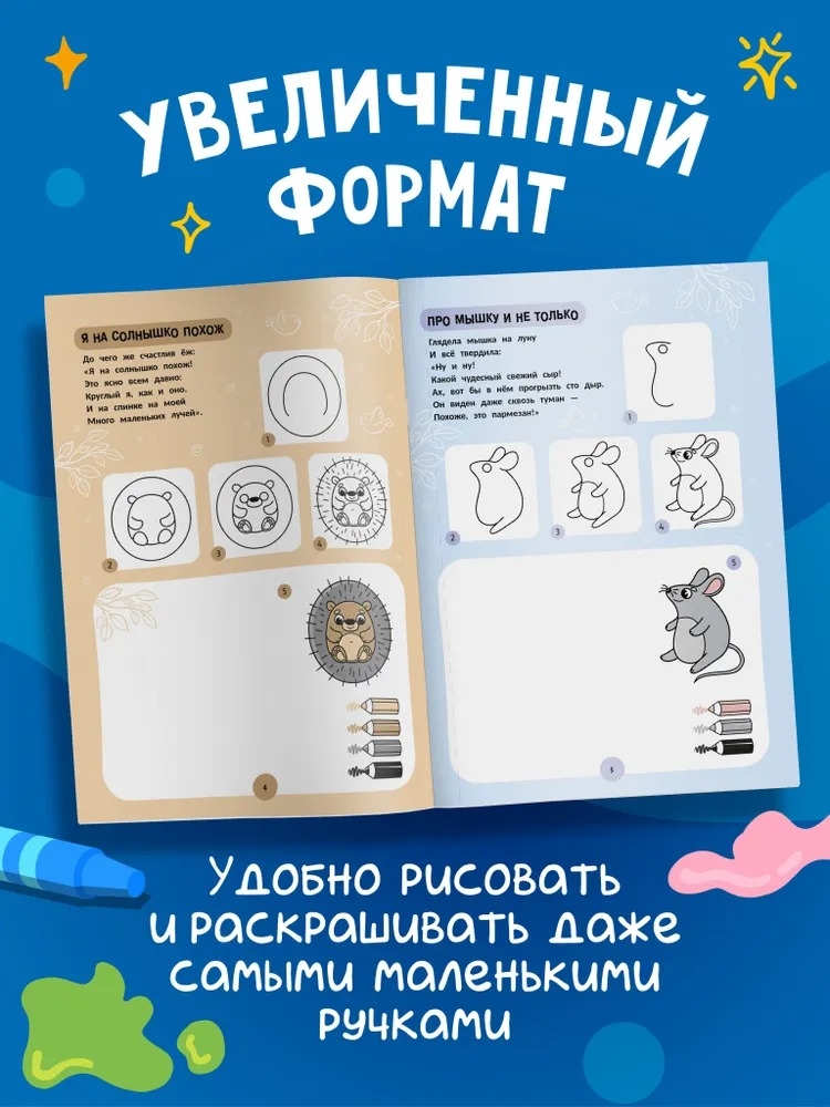 Откройте для ребёнка радость рисования с первых шагов! Серия раскрасок "Всех, кого я обожаю, на листе изображаю" – это поэтапные инструкции и весёлые стишки от Елены Степановой, которые превратят карандаши и фломастеры в волшебную палитру.