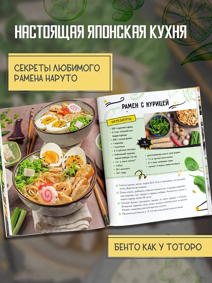 Хотите узнать секрет рамена, который так любит Наруто? Или попробовать идеальный бенто, как у Тоторо? "Кулинарная книга по аниме" откроет вам двери в мир настоящей японской кухни, вдохновленной любимыми мультфильмами. Готовьте, удивляйте и наслаждайтесь!